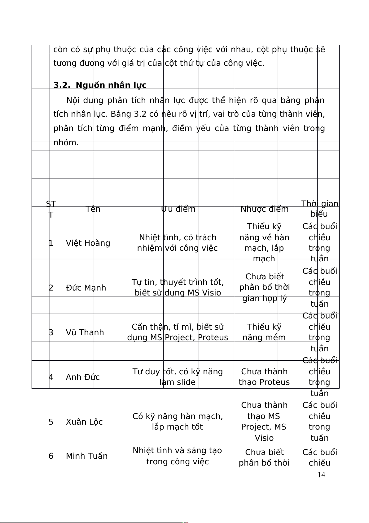 Cẩn thận, tỉ mỉ, biết sử Thiếu kỹ chiều 3 Vũ Thanh dụng MS Project, Proteus năng mềm trong tuần Các buổi Tư duy tốt, có kỹ năng Chưa thành chiều 4 Anh Đức làm slide thạo Proteus trong tuần Chưa thành Các buổi Có kỹ năng hàn mạch, thạo MS chiều 5 Xuân Lộc lắp mạch tốt Project, MS trong Visio tuần Nhiệt tình và sáng tạo 6 Minh Tuấn Chưa biết Các buổi trong công việc phân bố thời chiều 14 trong gian hợp lý tuần