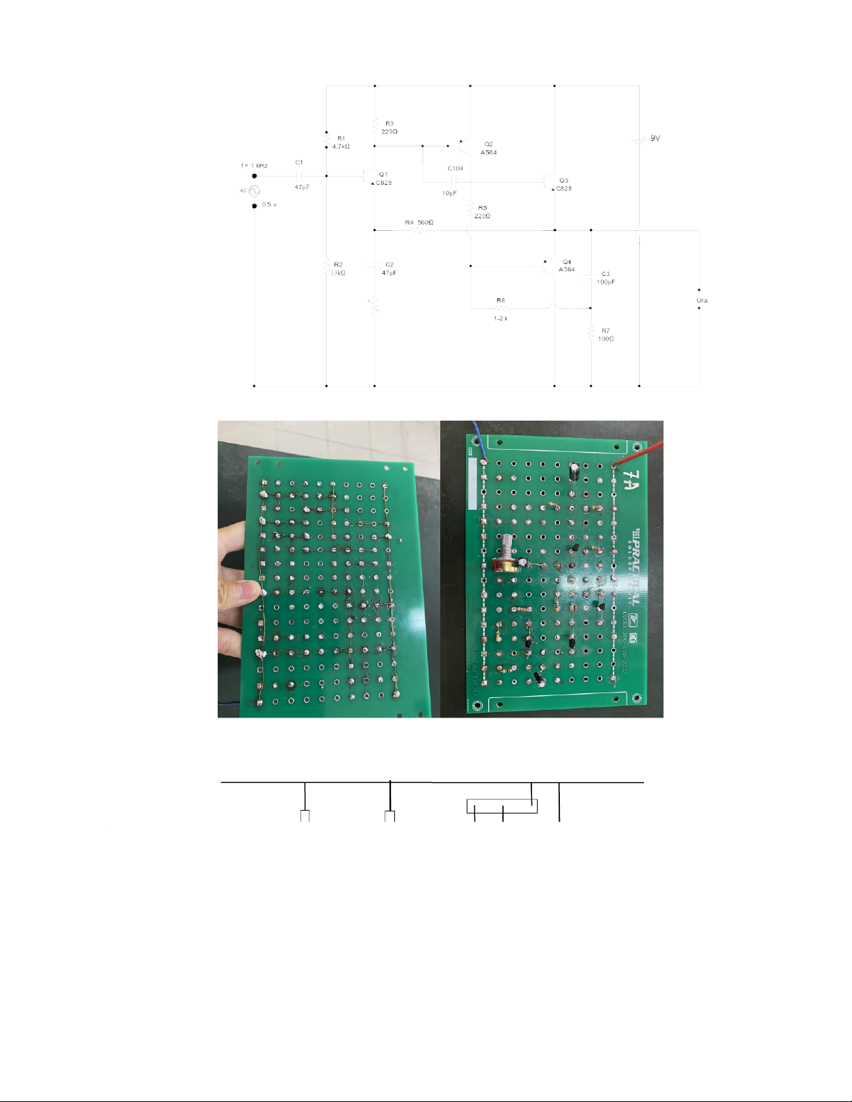 Tín hiệu vào dạng sin, biên độ 0.5V, tần số 1Khz được đưa vào cực B của Q1