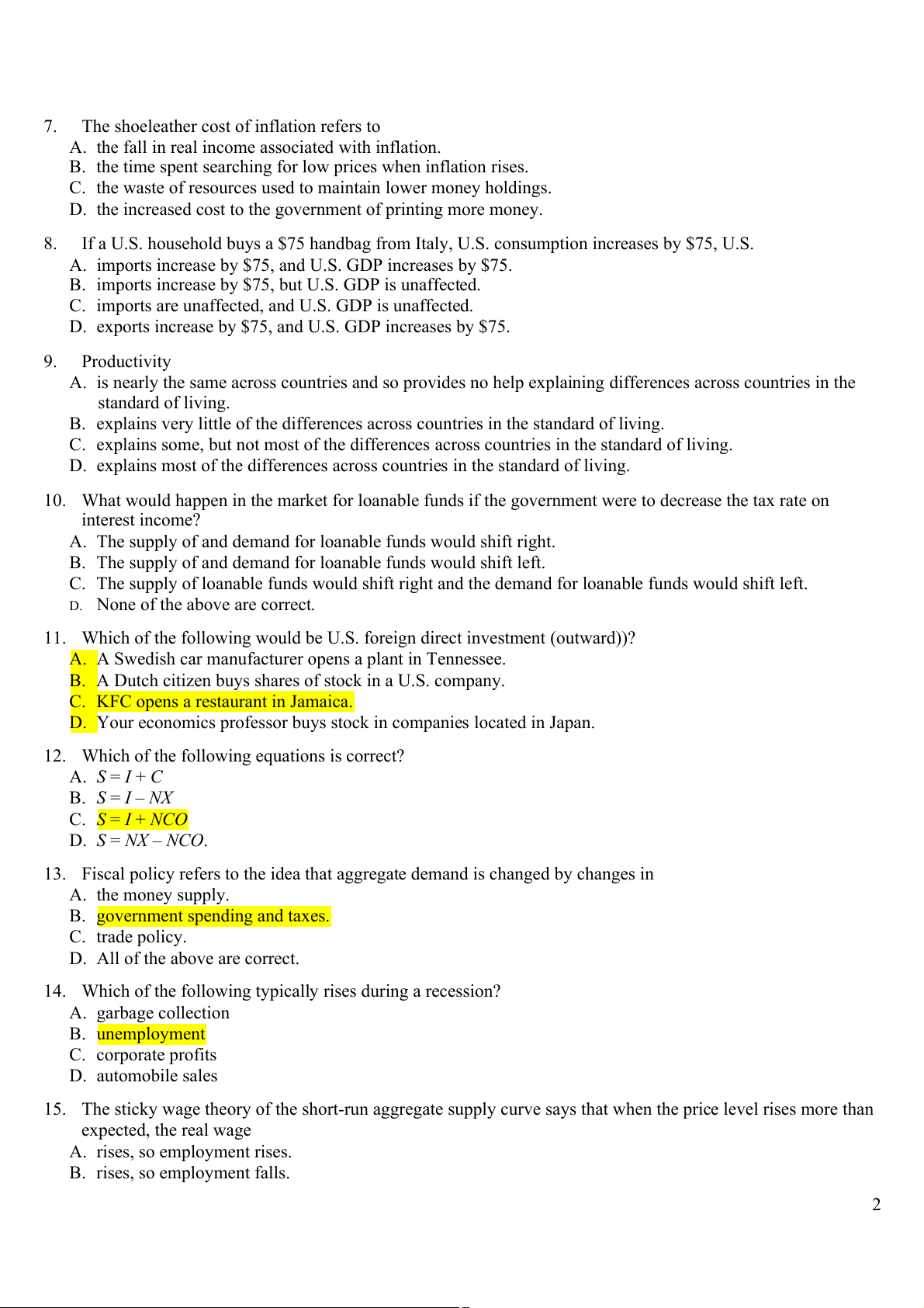 15. The sticky wage theory of the short-run aggregate supply curve says that when the price level rises more than expected, the real wage A. rises, so employment rises. B. rises, so employment falls. 2 C. falls, so employment rises. D. falls, so employment falls.