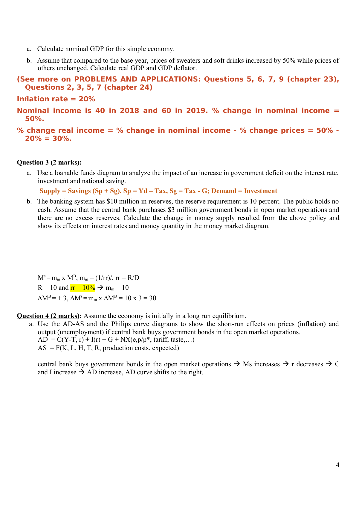 % change real income = % change in nominal income - % change prices = 50% - 20% = 30%. Question 3 (2 marks):