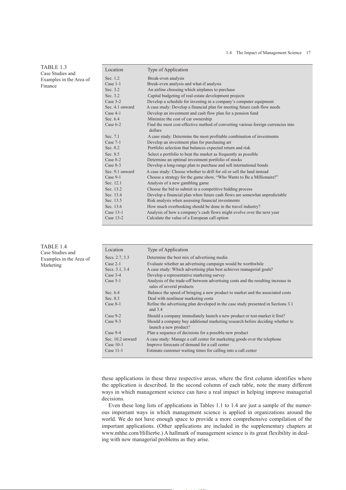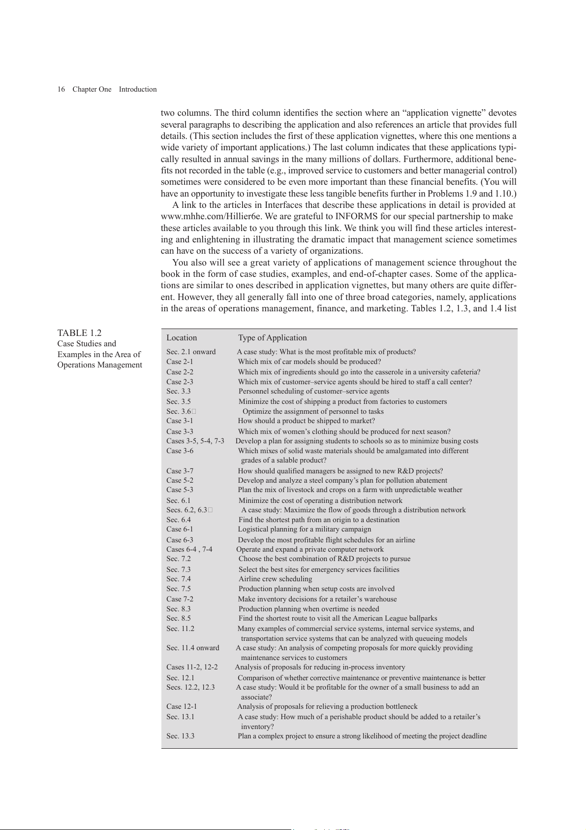 www.mhhe.com/Hillier6e. As indicated in Table 1.1, these applications sometimes resulted in