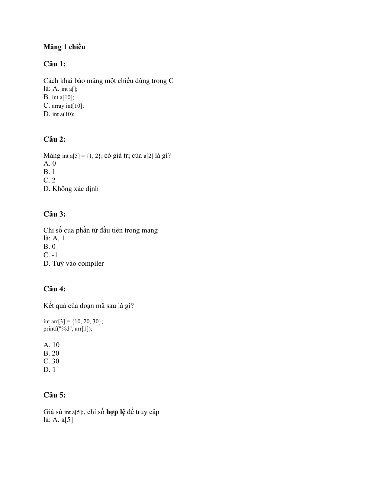 Kết quả của đoạn mã sau là gì? int arr[3] = {10, 20, 30}; printf("%d", arr[1]); A. 10 B. 20 C. 30 D. 1 Câu 5: