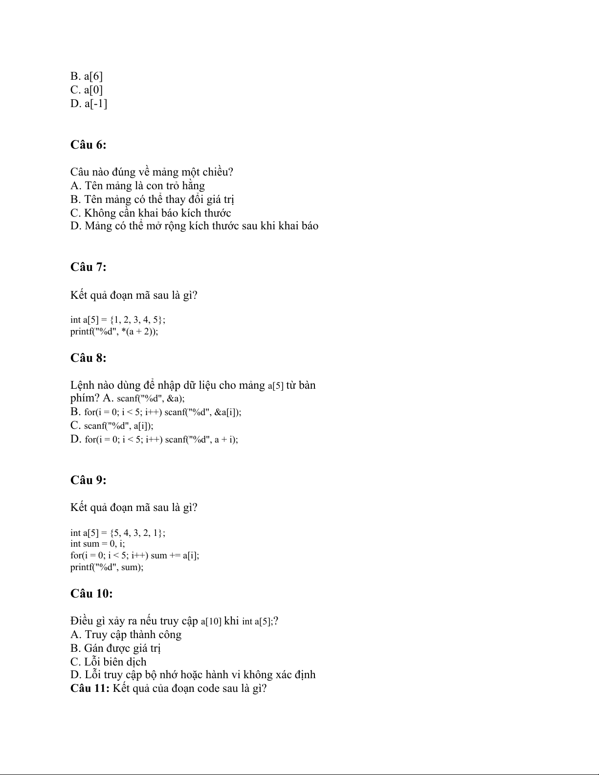 Giả sử int a[5];, chỉ số hợp lệ để truy cập là: A. a[5] B. a[6] C. a[0] D. a[-1] Câu 6: