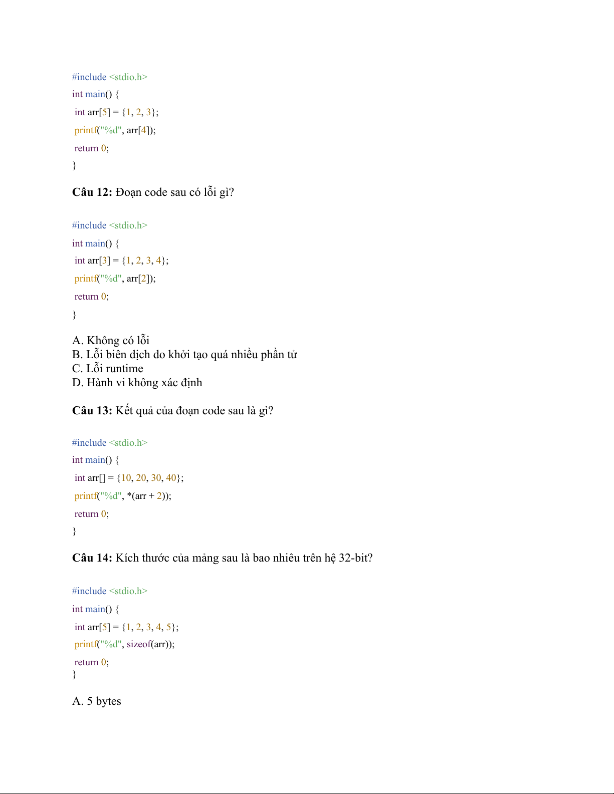 Mảng int a[5] = {1, 2}; có giá trị của a[2] là gì? A. 0 B. 1 C. 2 D. Không xác định Câu 3: