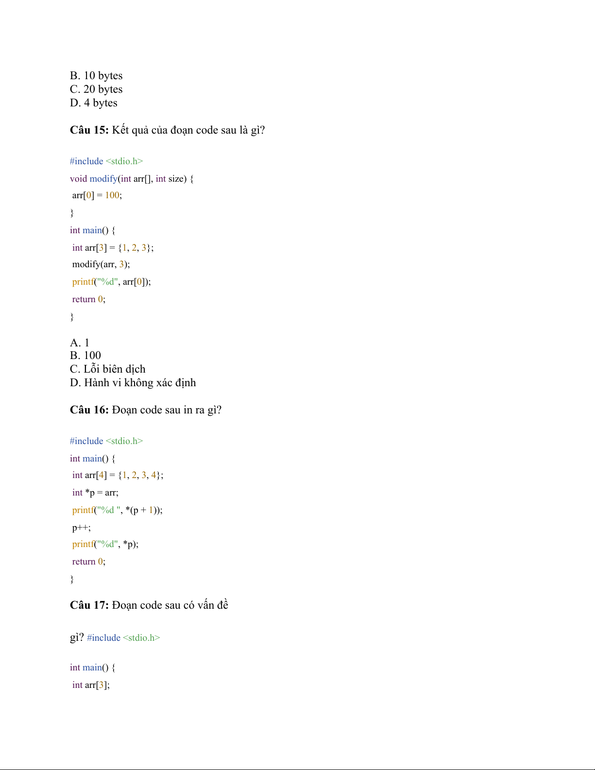Câu 17: Đoạn code sau có vấn đề gì? #include int main() { int arr[ ]; 3 arr[ ] = 3 10; printf("%d", arr[ ]); 3 return ; 0 } A. Không có lỗi