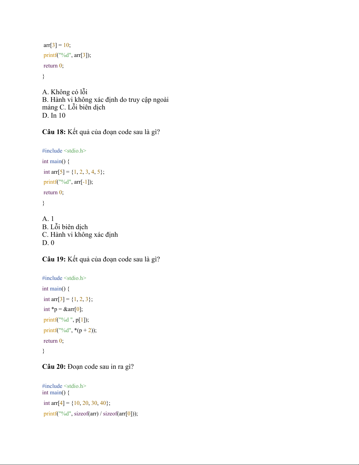 Câu 18: Kết quả của đoạn code sau là gì? #include int main() { int arr[ ] = { 5 , 1 , 2 , 3 , 4 5}; printf("%d", arr[-1]); return ; 0 } A. 1 B. Lỗi biên dịch
