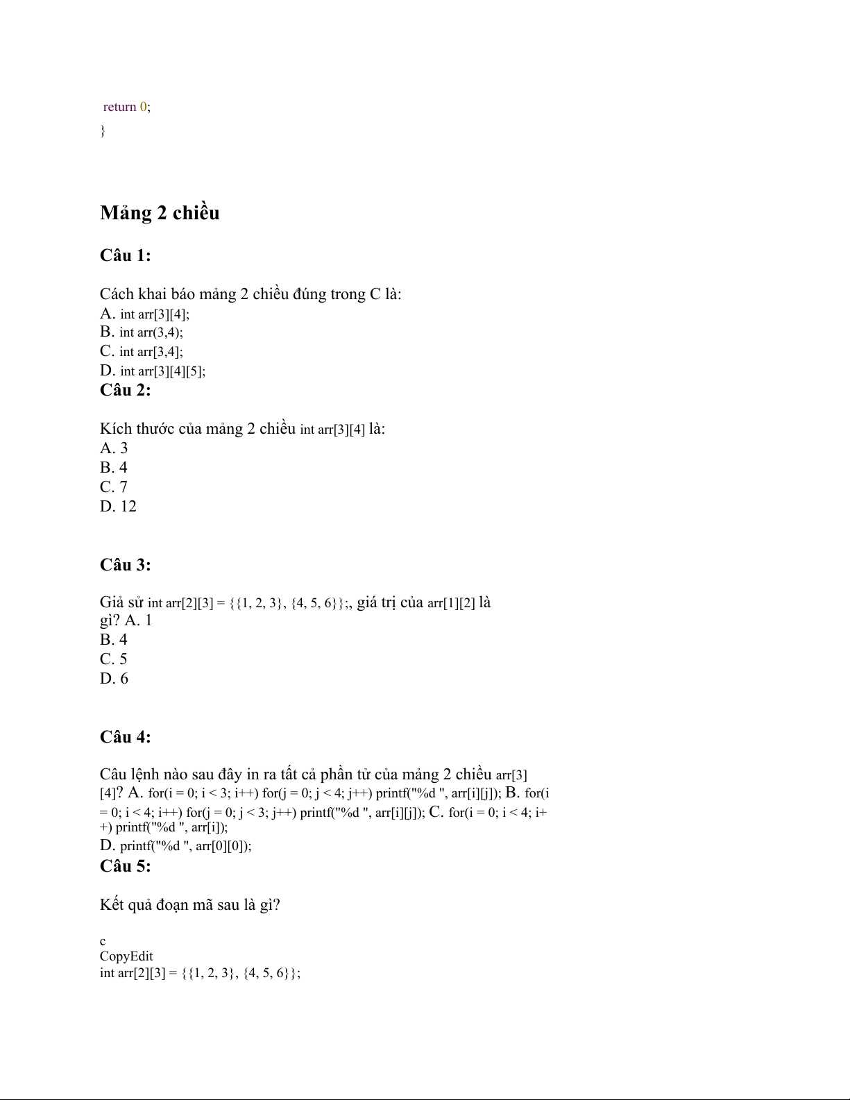 printf("%d", sizeof(arr) / sizeof(arr[ ])); 0 return ; 0 } Mảng 2 chiều Câu 1: