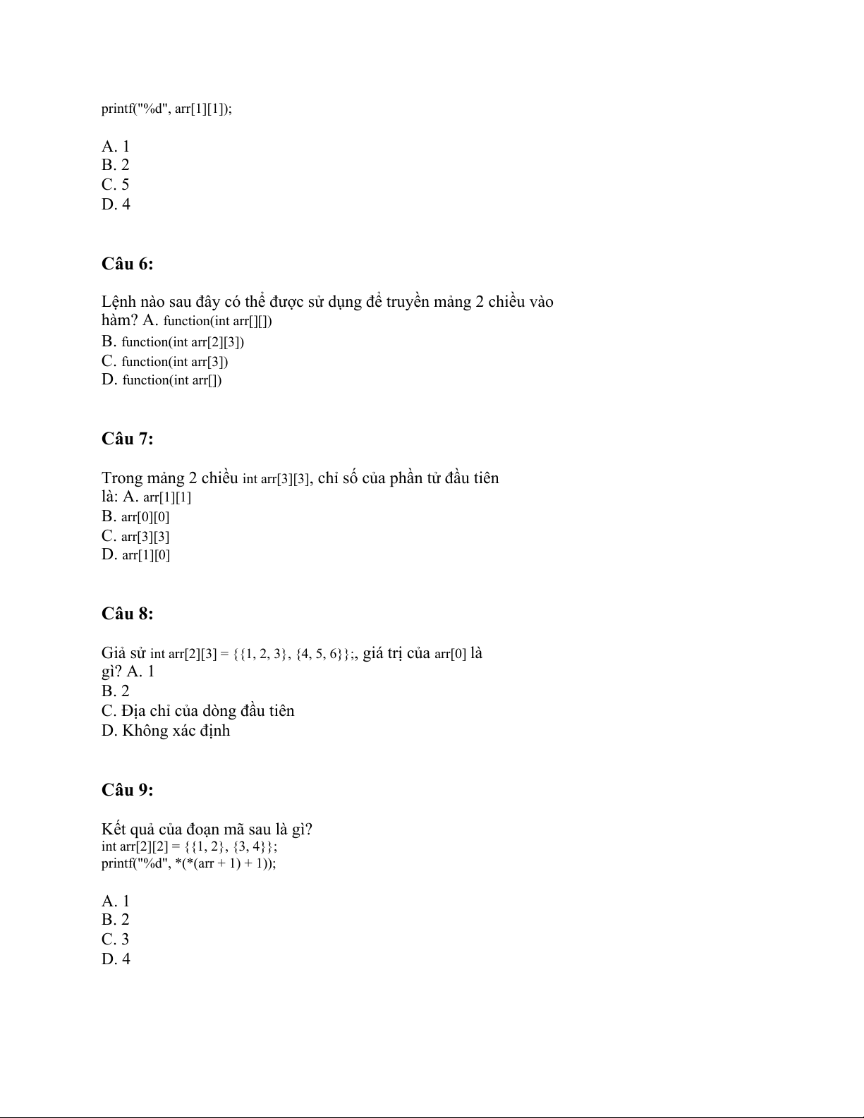 hàm? A. function(int arr[][]) B. function(int arr[2][3]) C. function(int arr[3]) D. function(int arr[]) Câu 7: