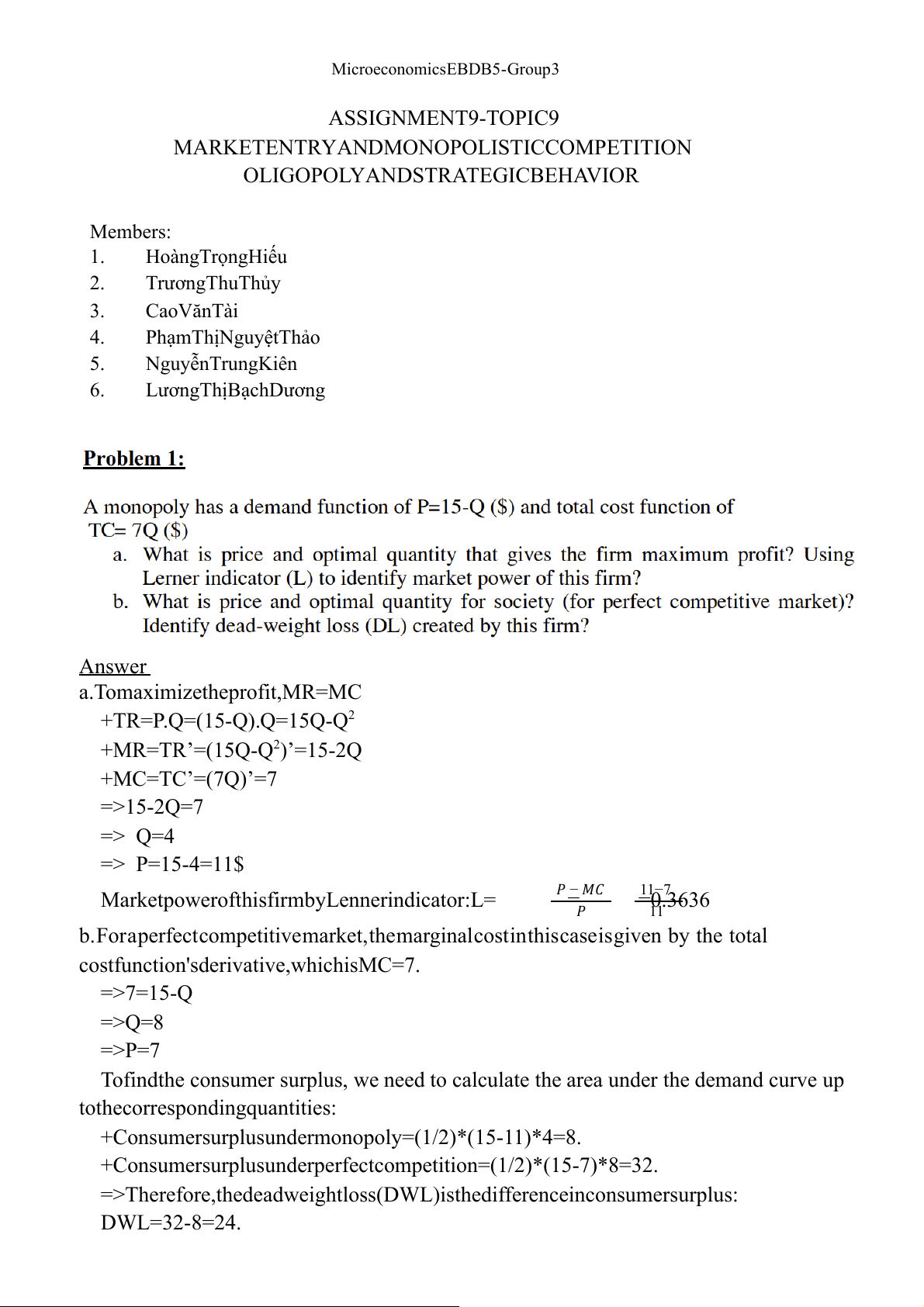 MARKETENTRYANDMONOPOLISTICCOMPETITION OLIGOPOLYANDSTRATEGICBEHAVIOR Members: 1. HoàngTrọngHiếu 2. TrươngThuThủy 3. CaoVănTài 4. PhạmThịNguyệtThảo 5. NguyễnTrungKiên 6. LươngThịBạchDương Answer a.Tomaximizetheprofit,MR=MC +TR=P.Q=(15-Q).Q=15Q-Q2 +MR=TR’=(15Q-Q2)’=15-2Q +MC=TC’=(7Q)’=7 =>15-2Q=7 => Q=4 => P=15-4=11$
