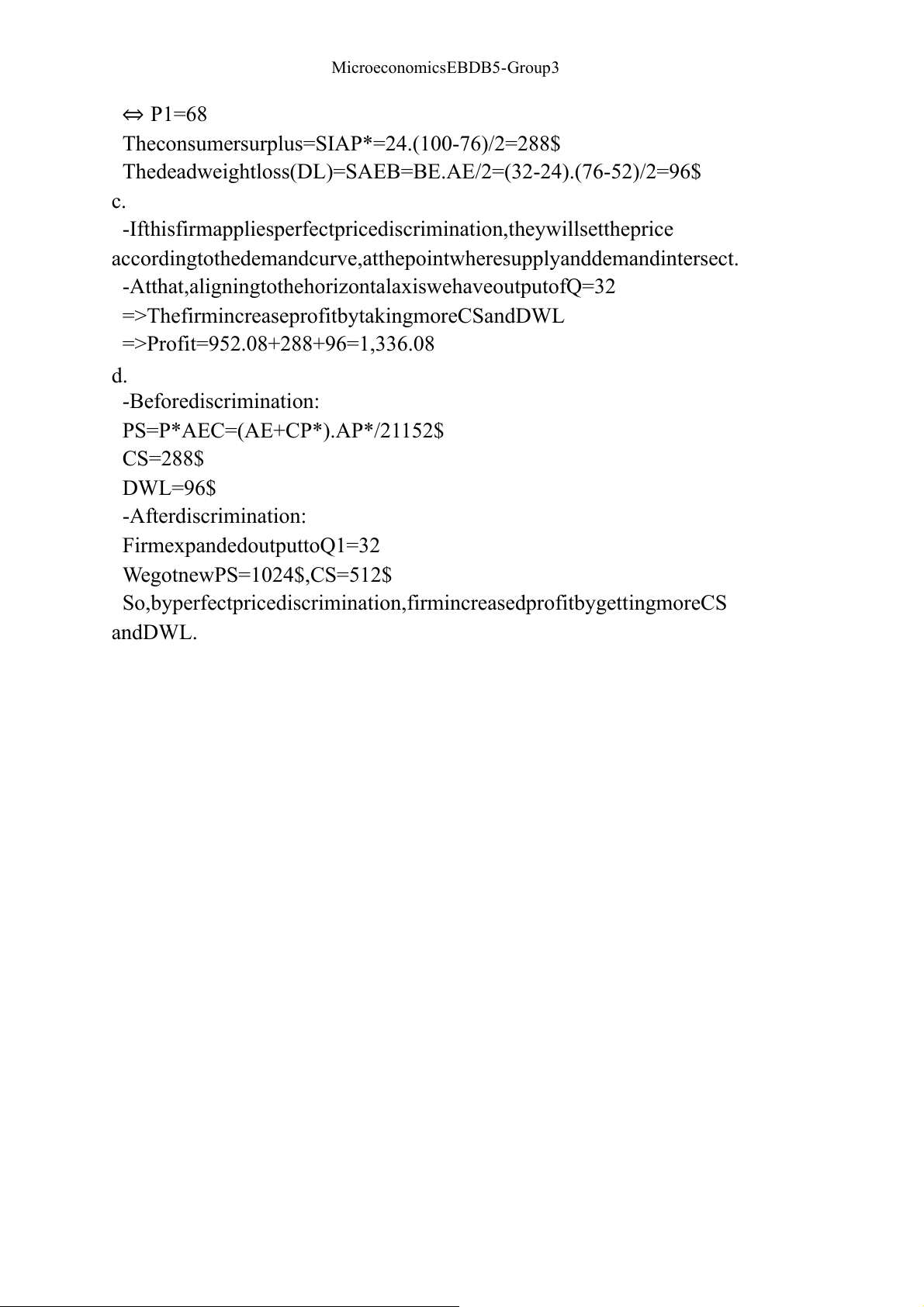 =>Profit=952.08+288+96=1,336.08 d. -Beforediscrimination: PS=P*AEC=(AE+CP*).AP*/21152$ CS=288$ DWL=96$ -Afterdiscrimination: FirmexpandedoutputtoQ1=32 WegotnewPS=1024$,CS=512$
