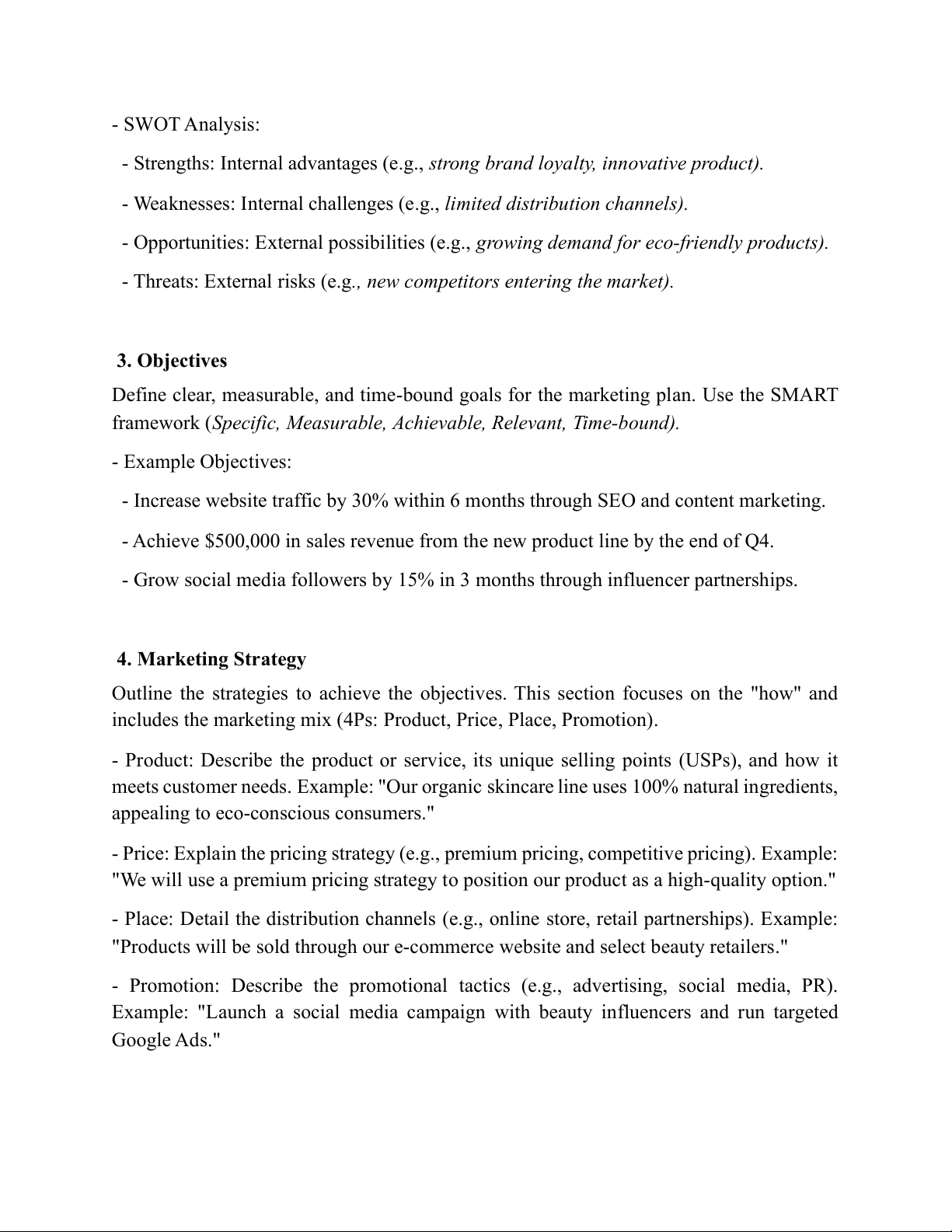 "Increase sales by 20% in Q3 through targeted social media campaigns"). 2. Situation Analysis