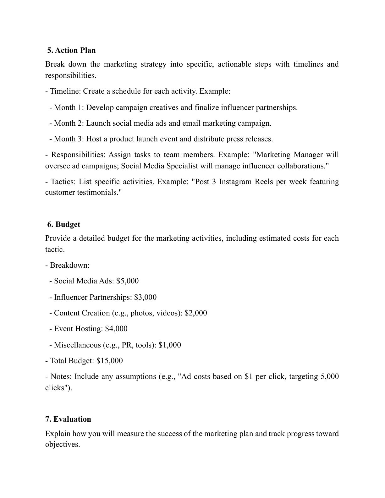 - Tactics: List specific activities. Example: "Post 3 Instagram Reels per week featuring customer testimonials." 6. Budget