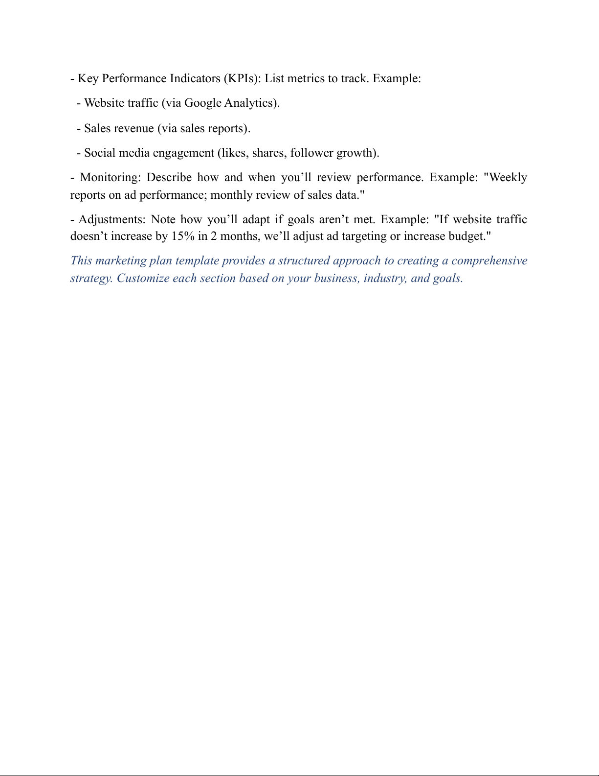 - Key Performance Indicators (KPIs): List metrics to track. Example: