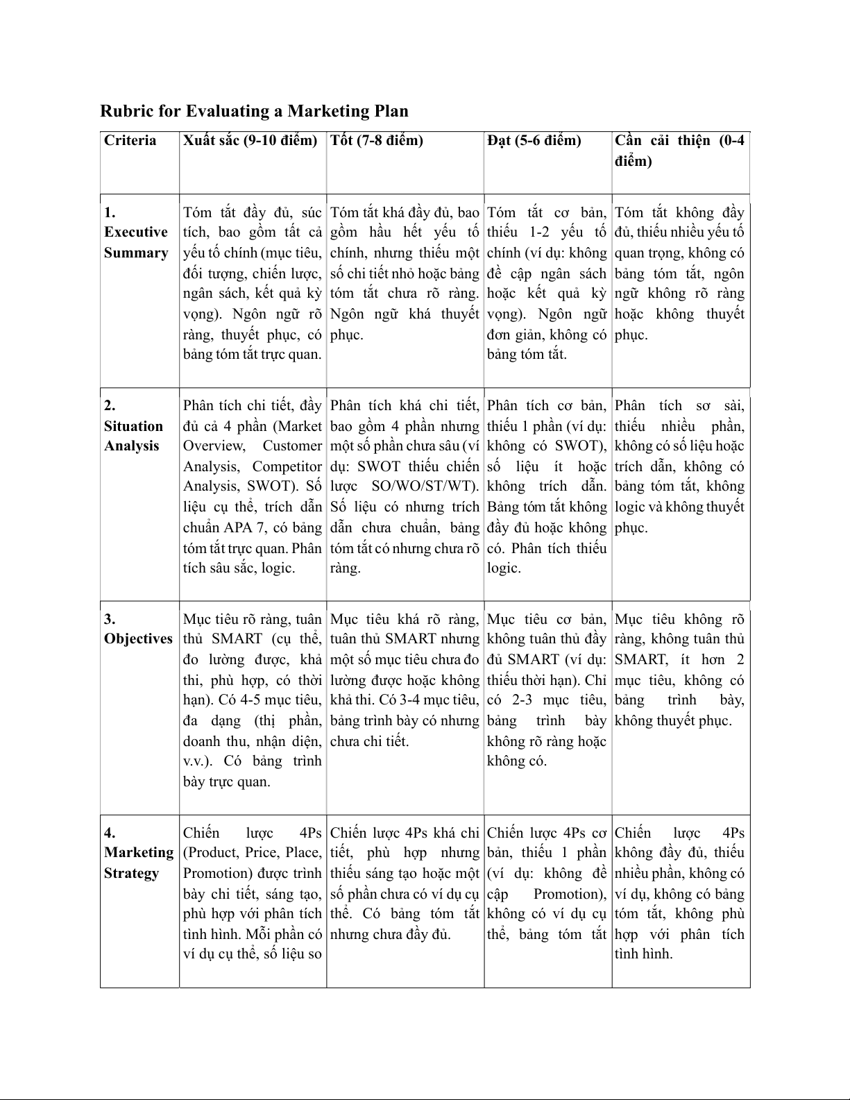 Marketing (Product, Price, Place, tiết, phù hợp nhưng bản, thiếu 1 phần không đầy đủ, thiếu Strategy