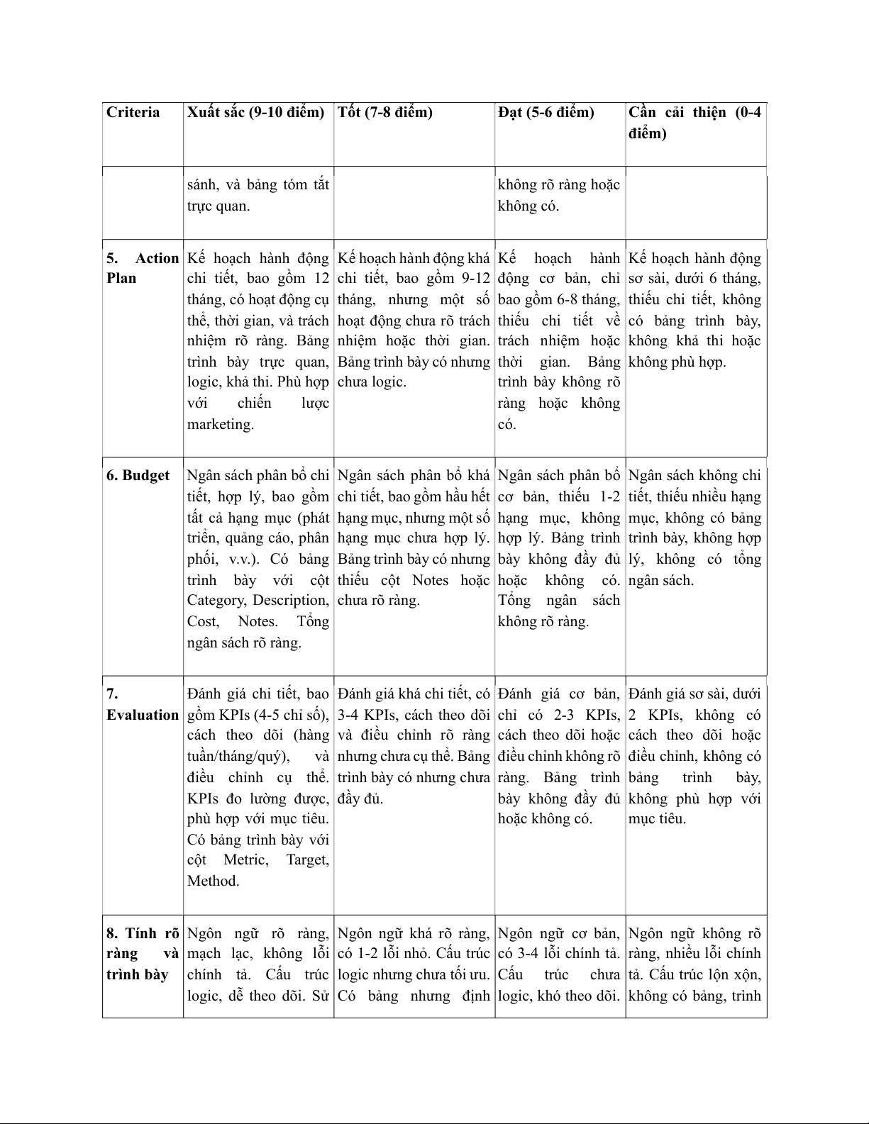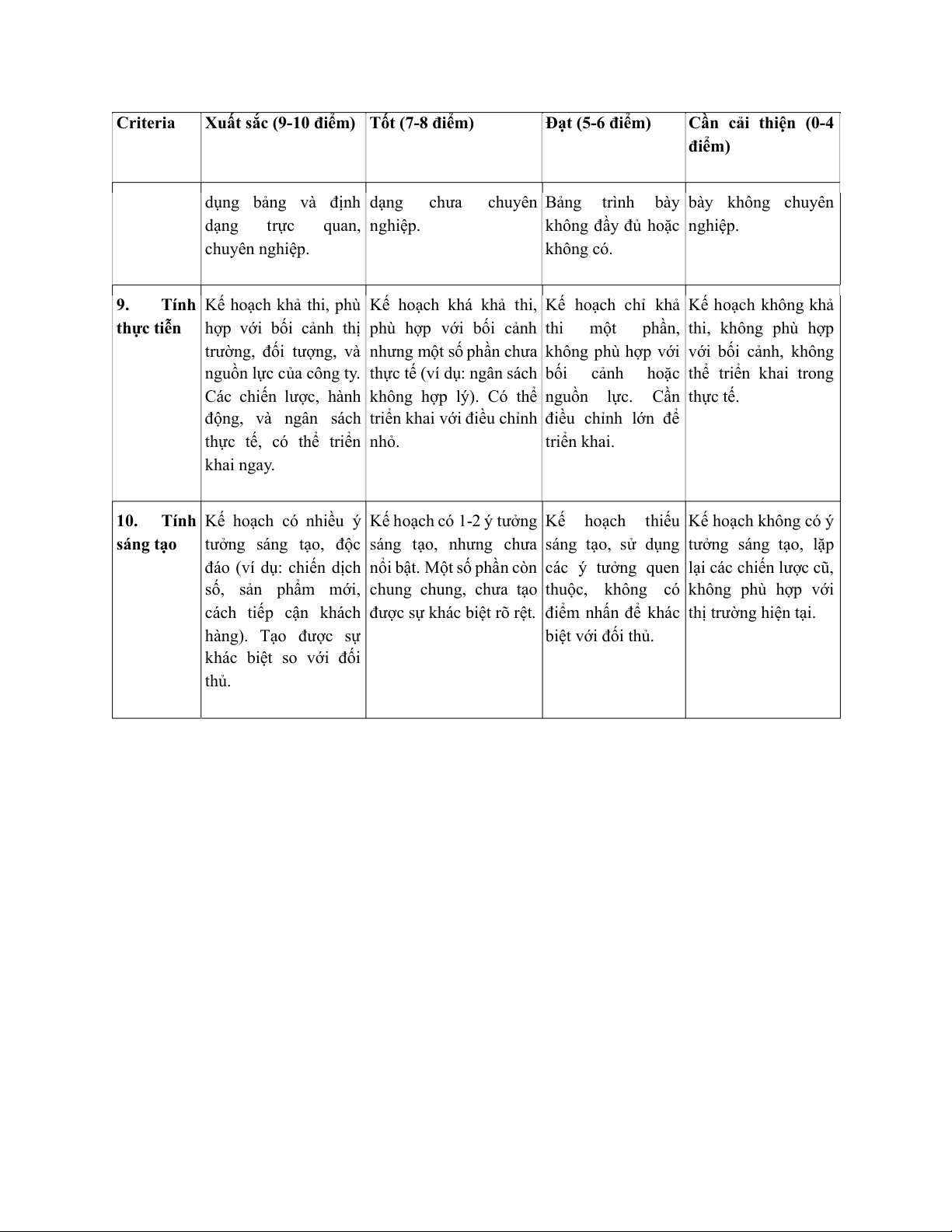 Xuất sắc (9-10 điểm) Tốt (7-8 điểm) Đạt (5-6 điểm) Cần cải thiện (0-4 điểm) sánh, và bảng tóm tắt không rõ ràng hoặc trực quan. không có.