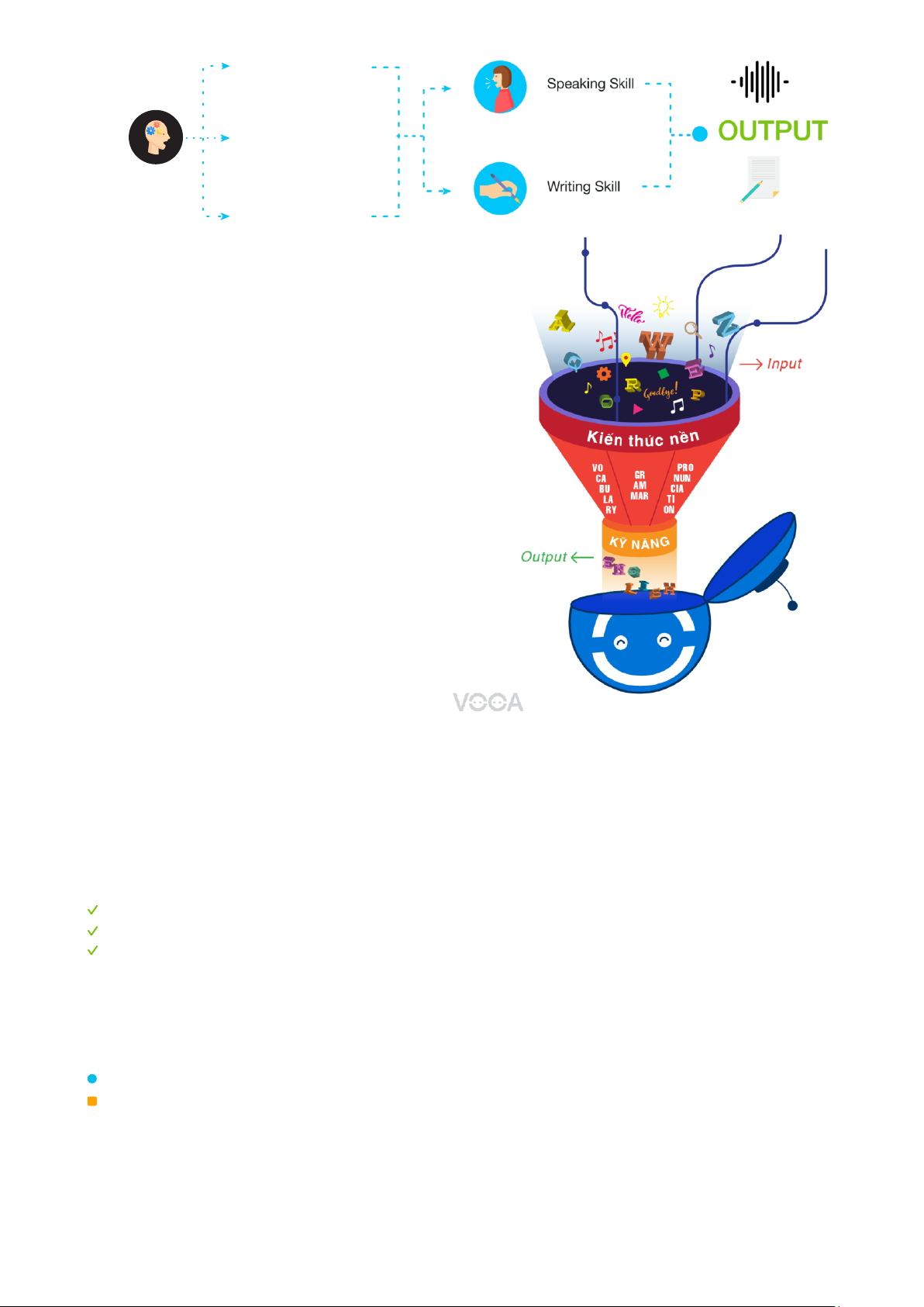 Output (Đầu ra) là những lời nói, bài viết, ký tự mà bạn thể hiện ra bên ngoài. Output thường xuất hiện cùng hành vi Nói và Viết. INPUT PRONUNCIATION Listening Skill GRAMMAR Reading Skill VOCABULARY