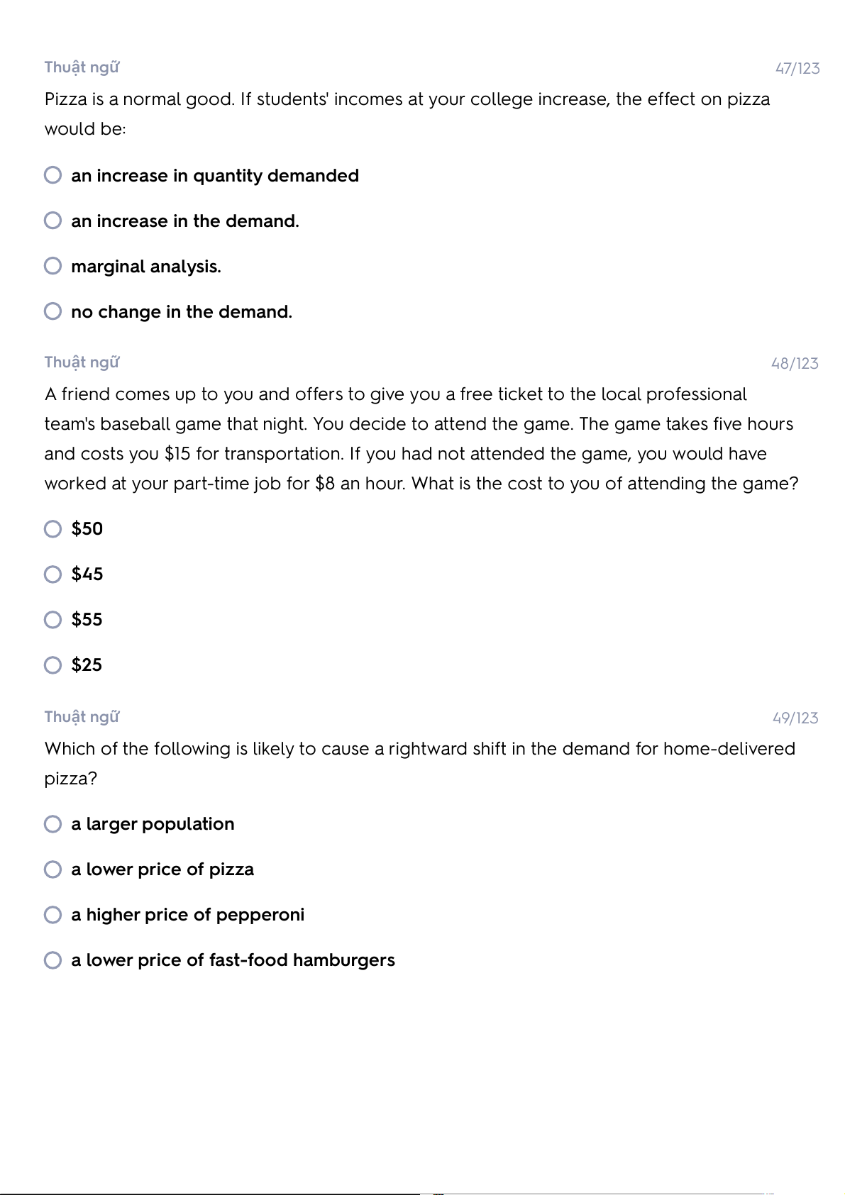 worked at your part-time job for $8 an hour. What is the cost to you of attending the game? $50 $45 $55 $25 Thuật ngữ 49/123