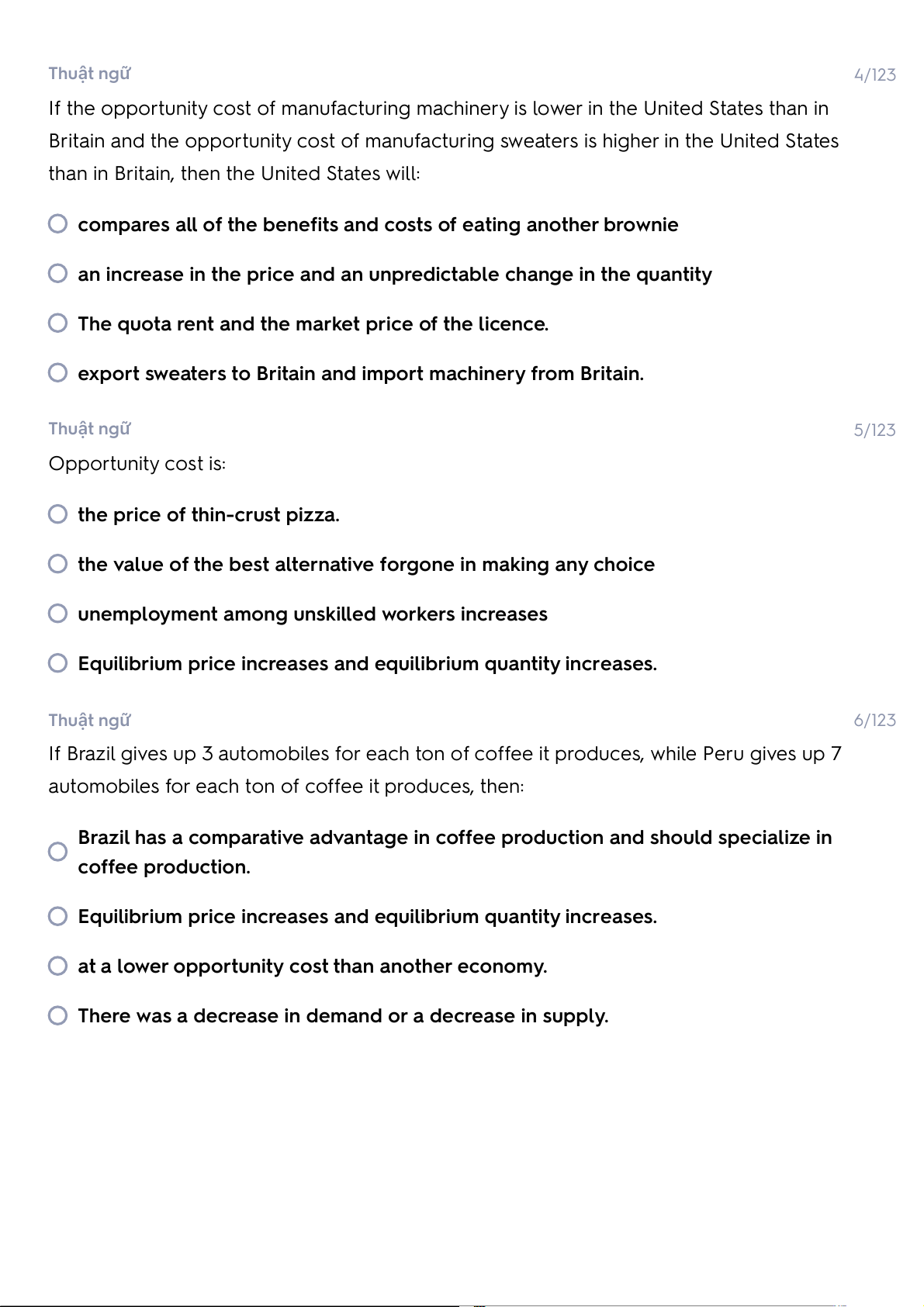 export sweaters to Britain and import machinery from Britain. Thuật ngữ 5/123 Opportunity cost is: the price of thin-crust pizza.