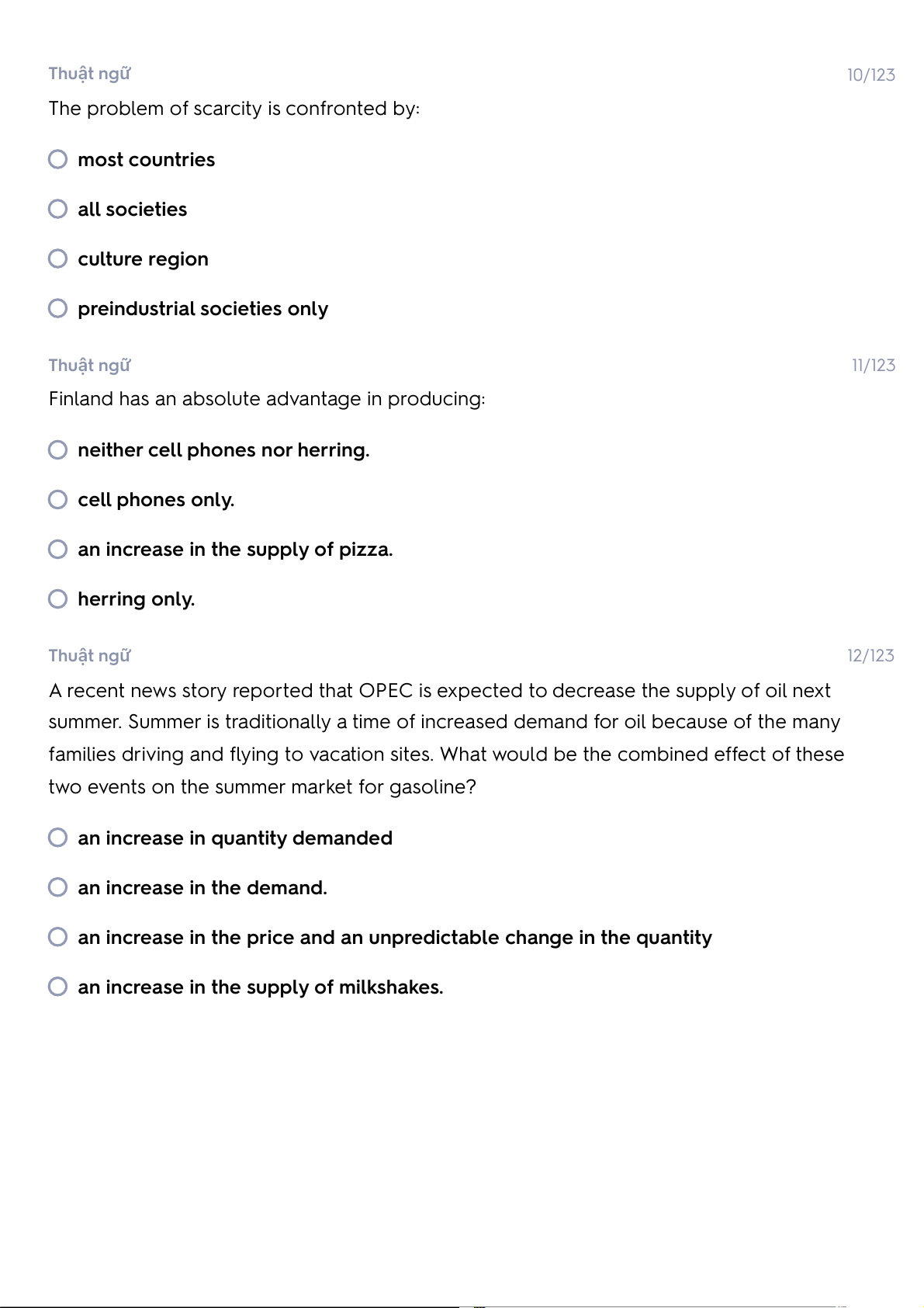 The problem of scarcity is confronted by: most countries all societies culture region preindustrial societies only Thuật ngữ 11/123