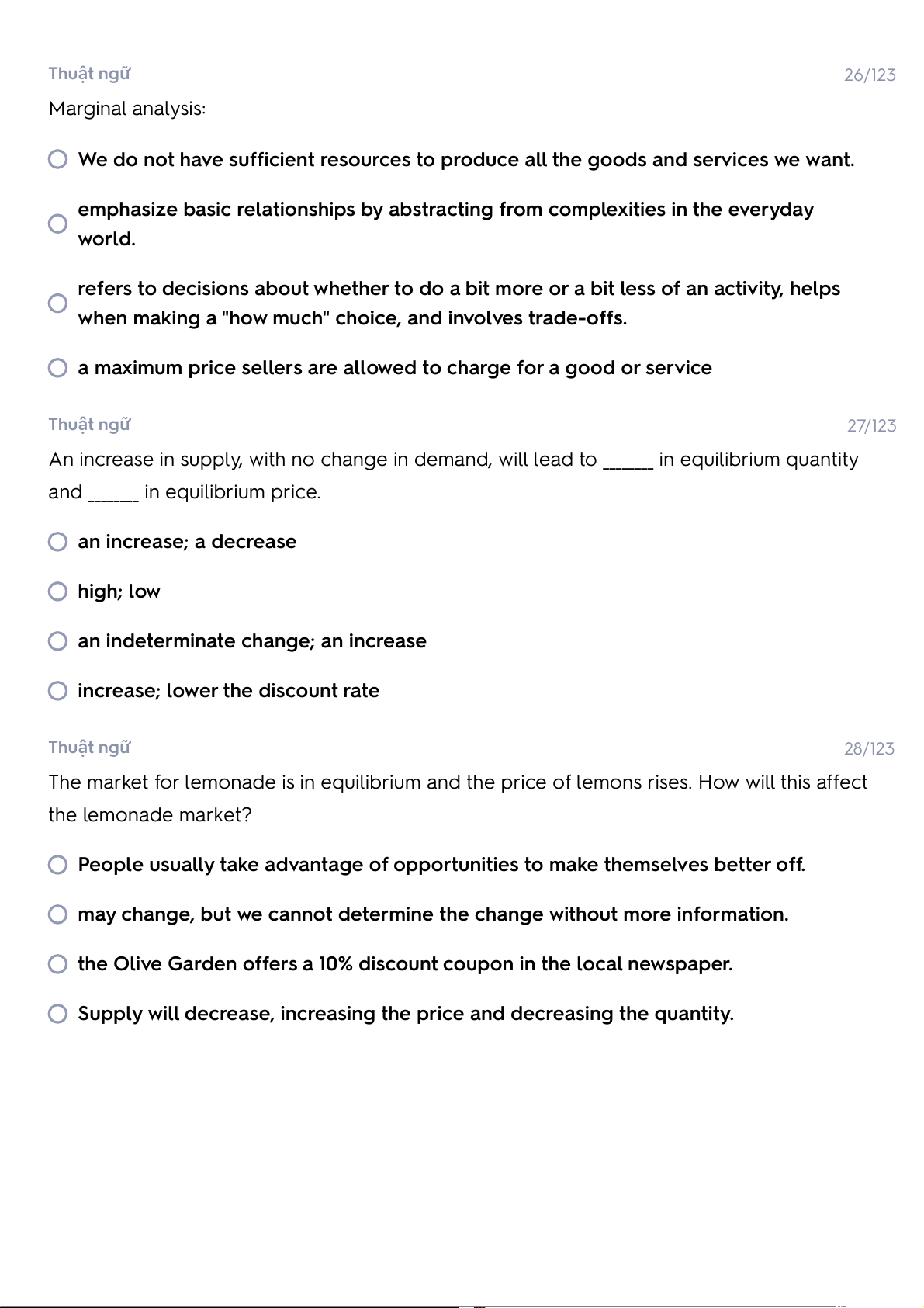 an increase in the supply of milkshakes. Thuật ngữ 13/123
