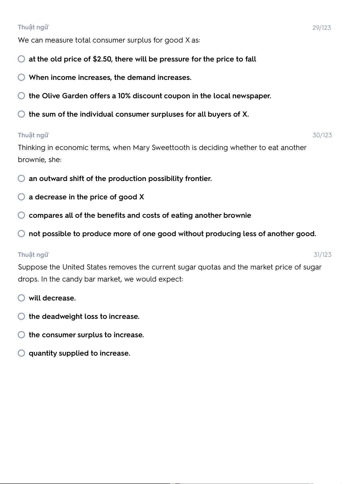 the sum of the individual consumer surpluses for all buyers of X. Thuật ngữ 30/123