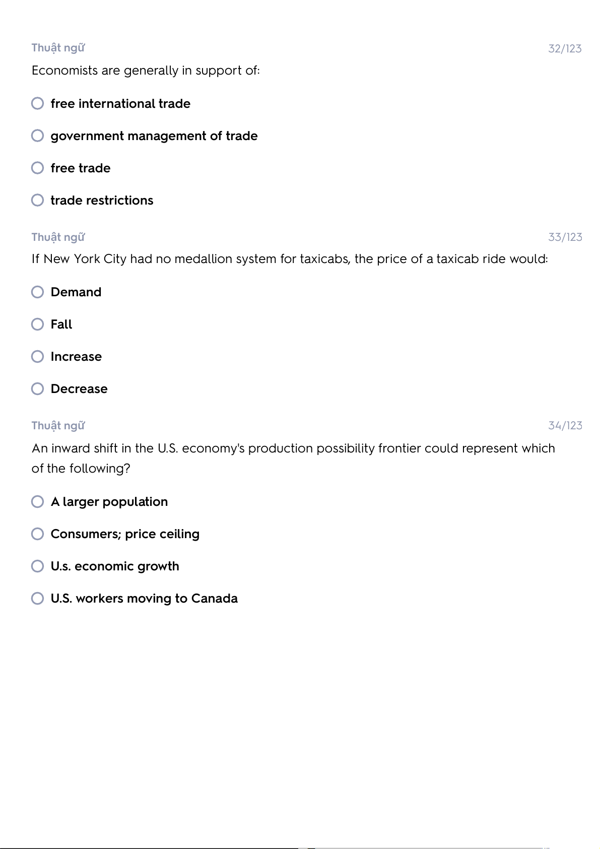 Economists are generally in support of: free international trade government management of trade free trade trade restrictions Thuật ngữ 33/123