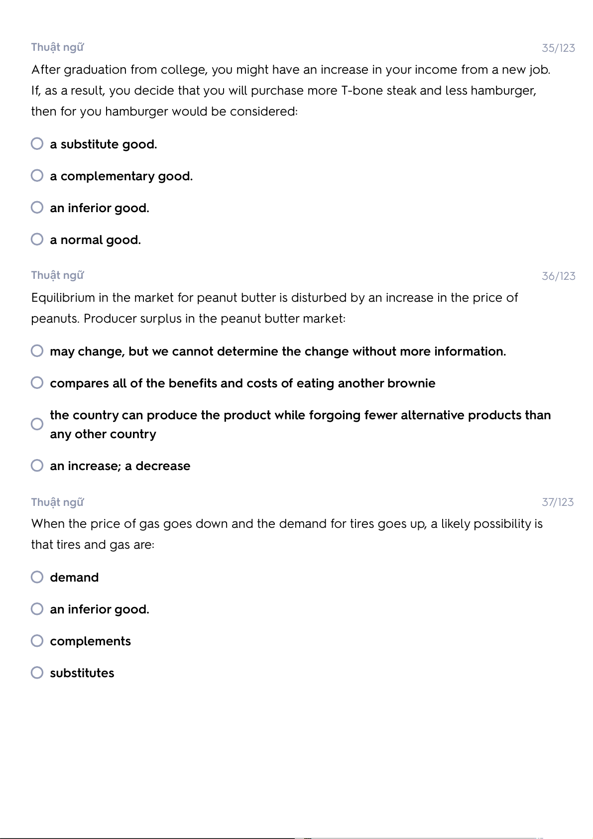 then for you hamburger would be considered: a substitute good. a complementary good. an inferior good. a normal good. Thuật ngữ 36/123
