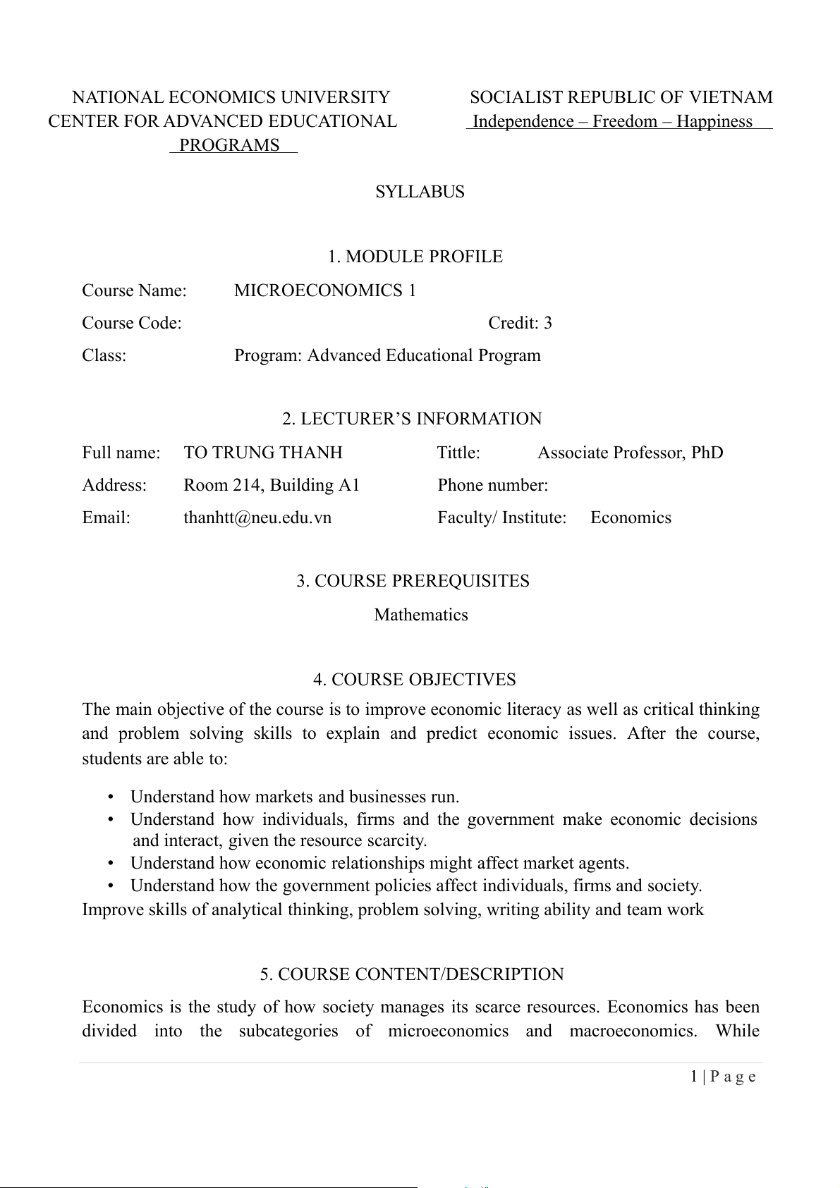 Program: Advanced Educational Program 2. LECTURER’S INFORMATION Full name: TO TRUNG THANH Tittle: Associate Professor, Ph D Address: Room 214, Building A1 Phone number: Email: thanhtt@neu.edu.v n Faculty/ Institute: Economics 3. COURSE PREREQUISITES Mathematics 4. COURSE OBJECTIVES