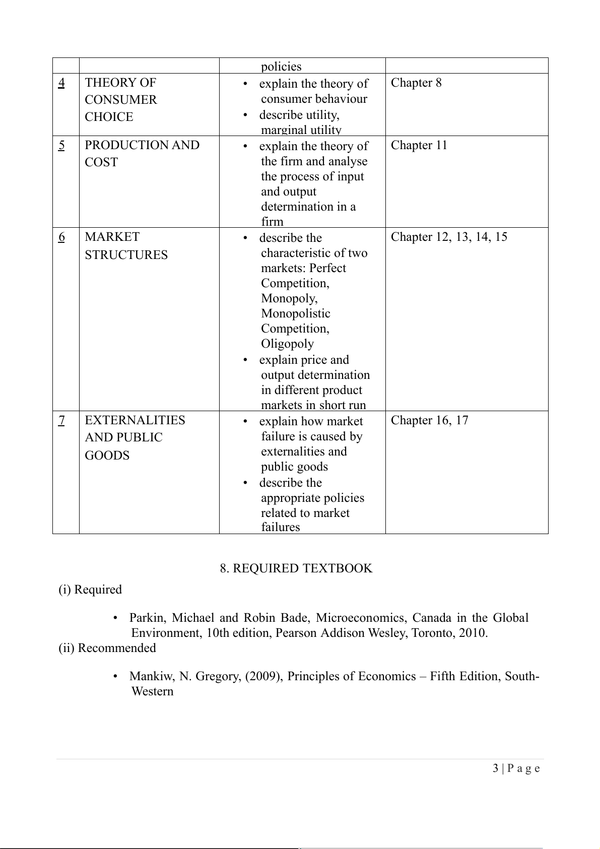• describe elasticity and Chapter 4 its applications • apply the demand supply model to analyse various economic events and 2 | P a g e policies 4 THEORY OF • explain the theory of Chapter 8 CONSUMER consumer behaviour CHOICE • describe utility, marginal utility 5 PRODUCTION AND • explain the theory of Chapter 11 COST the firm and analyse the process of input and output determination in a firm 6 MARKET • describe the Chapter 12, 13, 14, 15 STRUCTURES characteristic of two markets: Perfect Competition, Monopoly, Monopolistic Competition, Oligopoly • explain price and output determination in different product markets in short run 7 EXTERNALITIES • explain how market Chapter 16, 17 AND PUBLIC failure is caused by GOODS externalities and public goods • describe the appropriate policies related to m r a ket failures 8. REQUIRED TEXTBOOK (i) Required