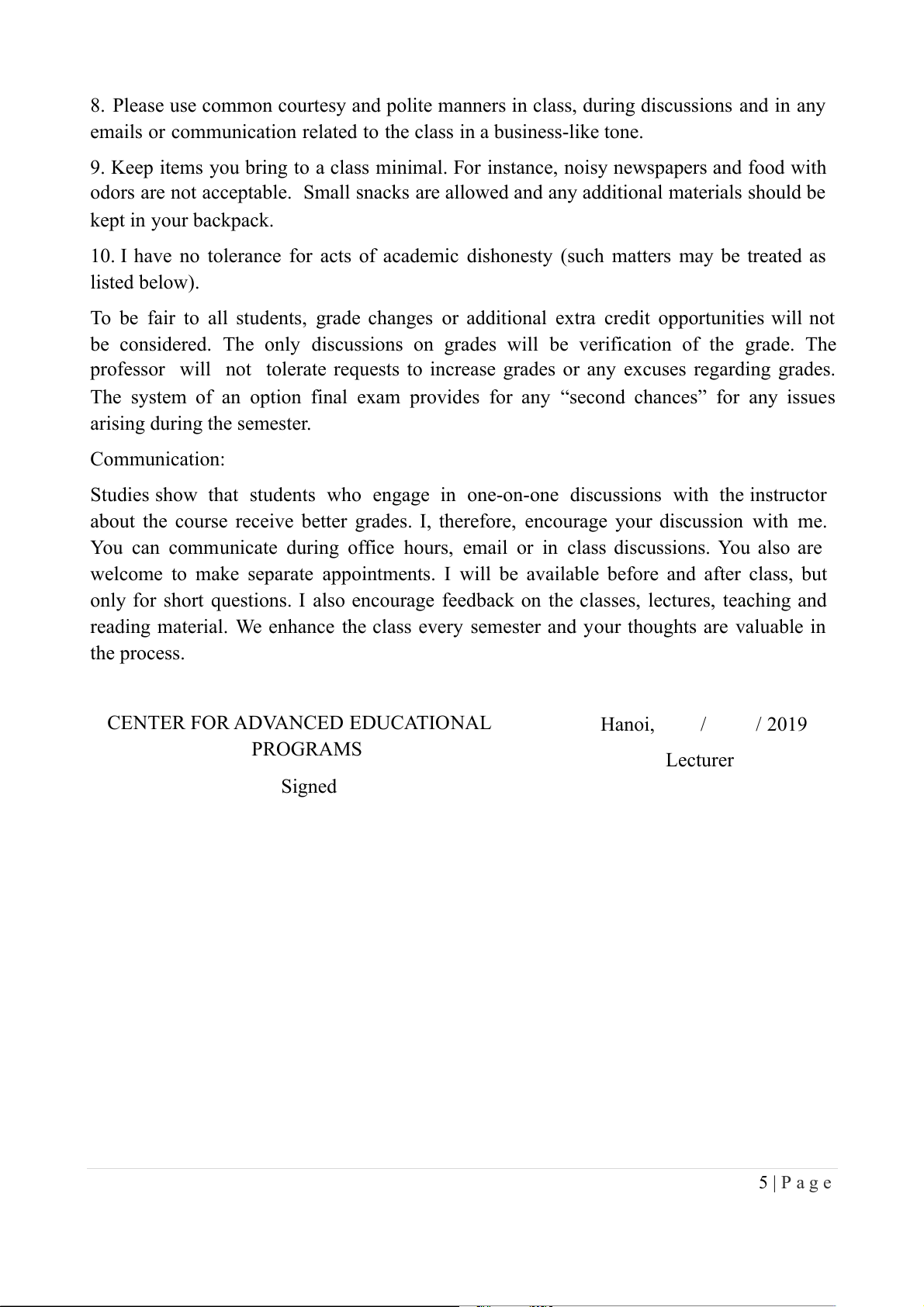 CENTER FOR ADVANCED EDUCATIONAL Hanoi, / / 2019 PROGRAMS Lecturer Signed 5 | P a g e