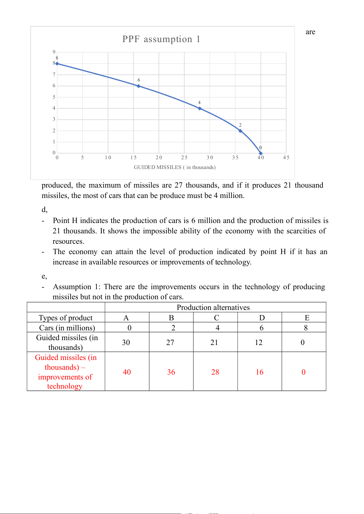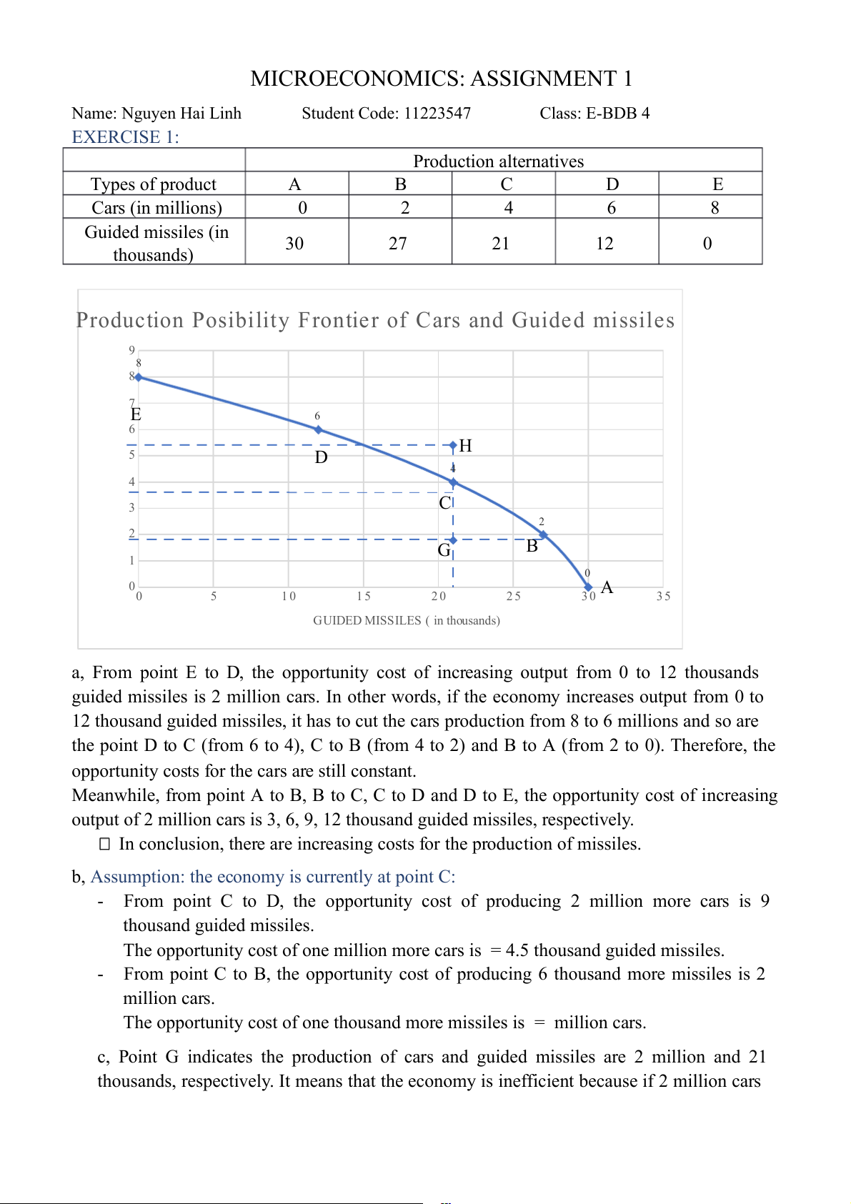 Student Code: 1223547 Class: E-BDB 4 EXERCISE 1: Production alternatives Types of product A B C D E Cars (in millions) 0 2 4 6 8 Guided missiles (in 30 27 21 12 0 thousands)