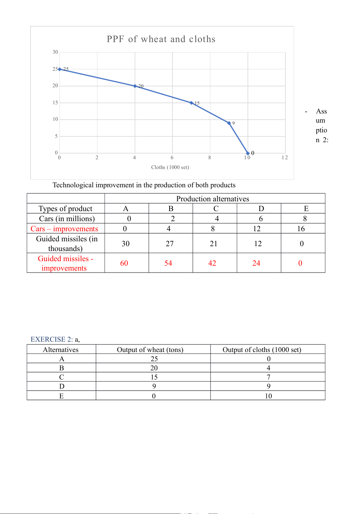 Technological improvement in the production of both products Production alternatives Types of product A B C D E Cars (in millions) 0 2 4 6 8 Cars – improvements 0 4 8 12 16 Guided missiles (in 30 27 21 12 0 thousands) Guided missiles - 60 54 42 24 0 improvements EXERCISE 2: a, Alternatives Output of wheat (tons) Output of cloths (1000 set) A 25 0 B 20 4 C 15 7 D 9 9 E 0 10