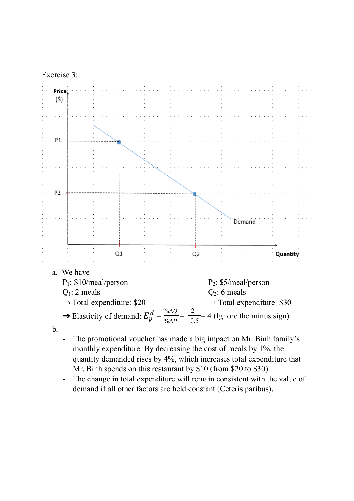 will increase. As a result, it is predicted that the demand for ice cream will go down and the demand curve will move to the left. In conclusion, the decrease of the bee population will affect the market of ice cream in a rough way as ice cream is an elastic product. Exercise 3: a. We have P1: $10/meal/person P2: $5/meal/person Q1: 2 meals Q2: 6 meals → Total expenditure: $20 → Total expenditure: $30 ➔ %∆𝑄 2