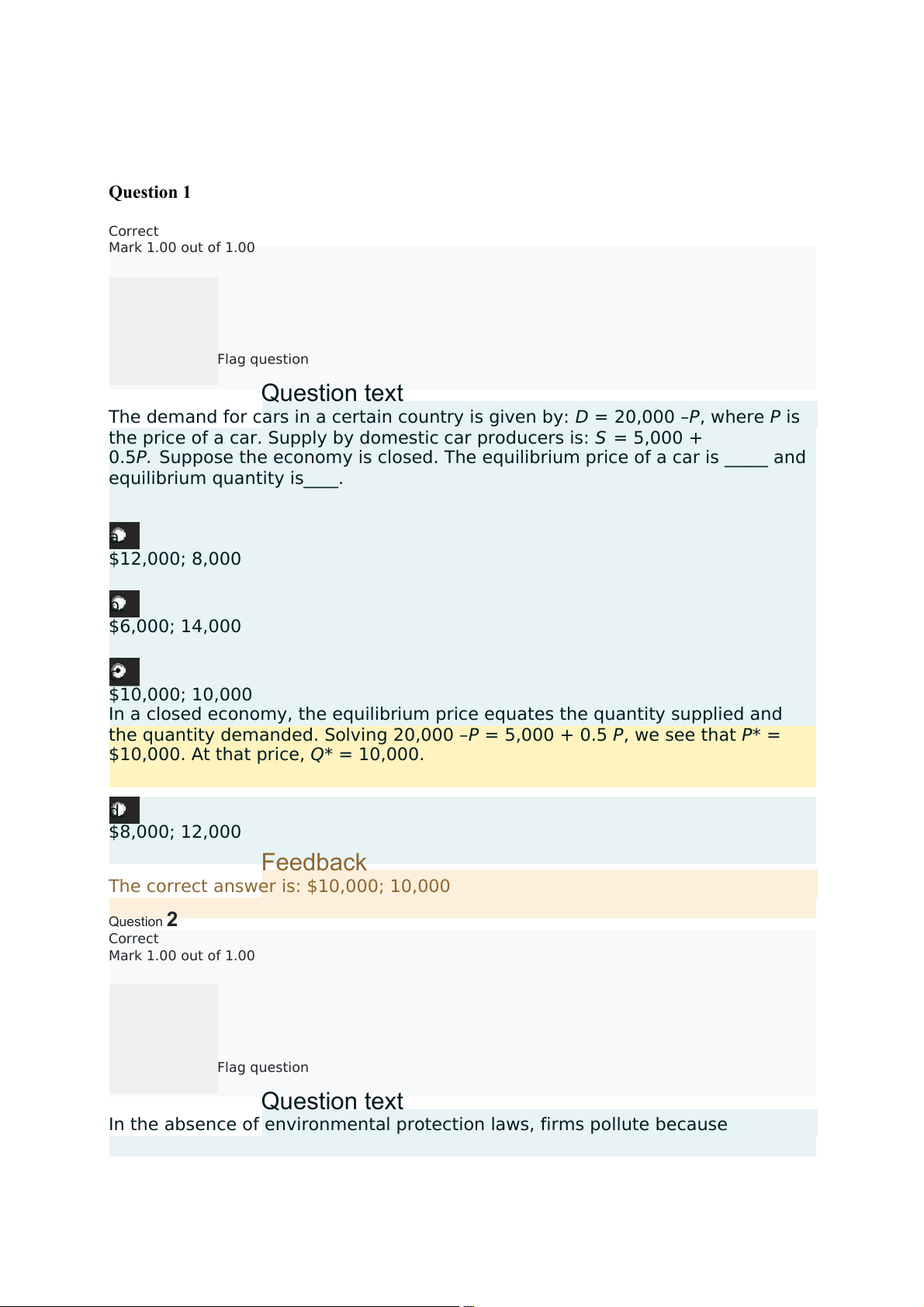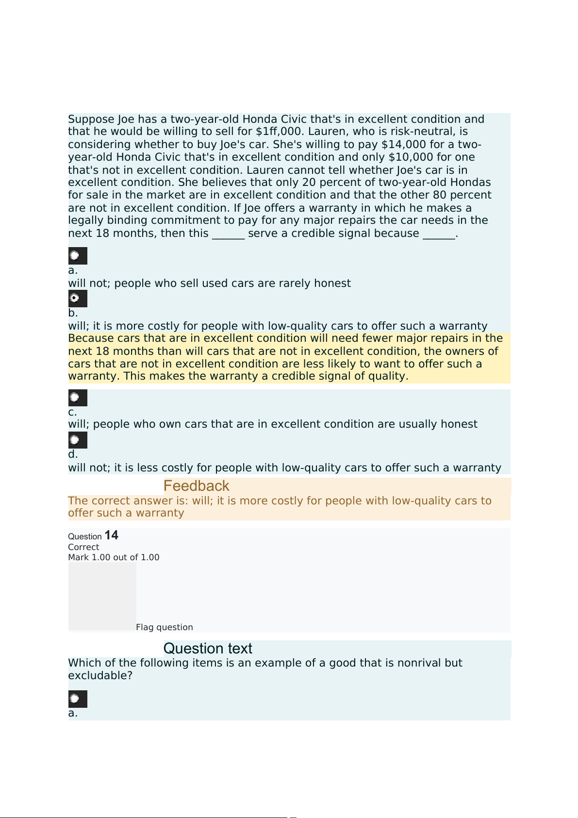 The correct answer is: will; it is more costly for people with low-quality cars to offer such a warranty Question 14 Correct Mark 1.00 out of 1.00 Flag question Question text
