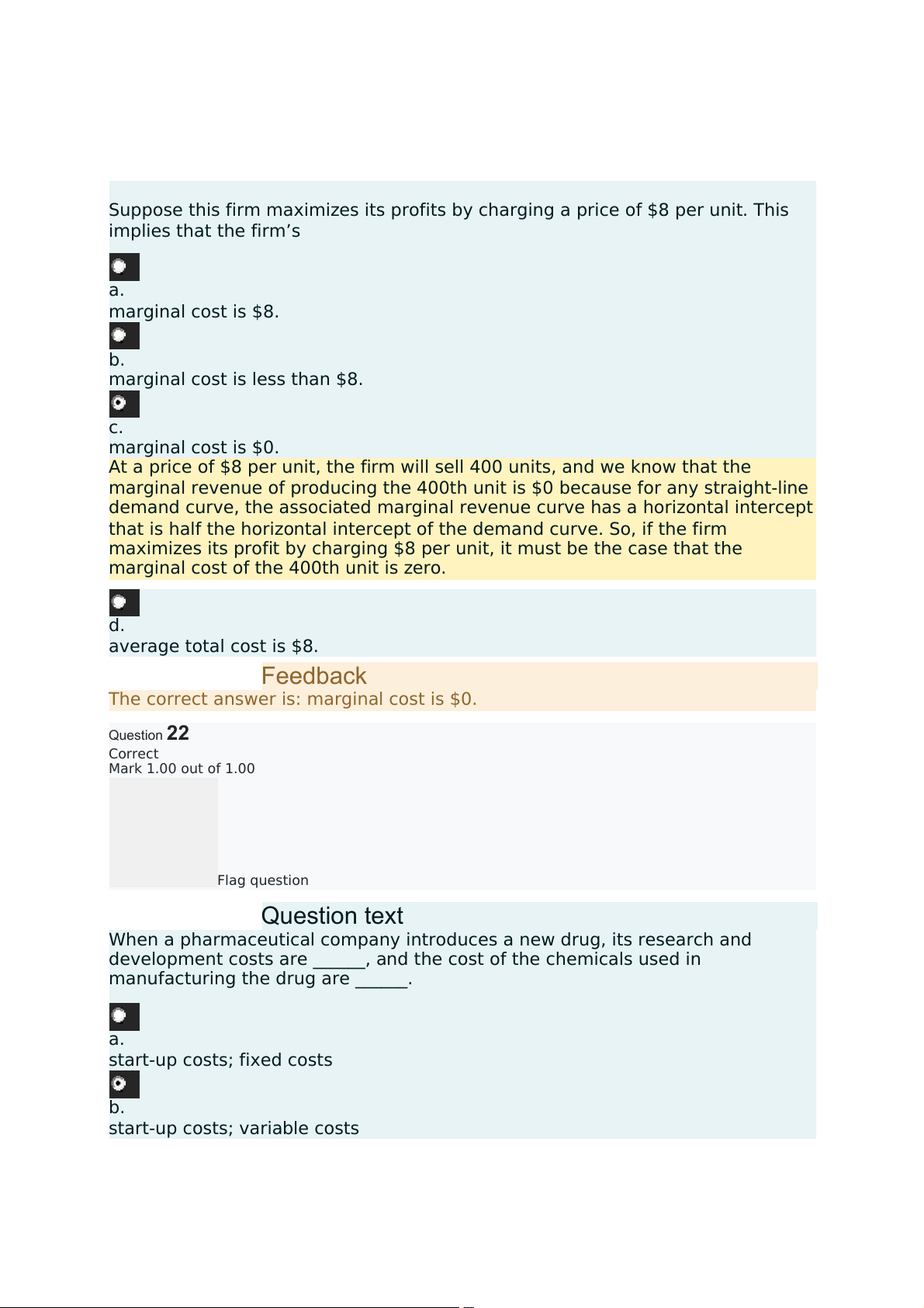 The correct answer is: marginal cost is $0. Question 22 Correct Mark 1.00 out of 1.00 Flag question Question text