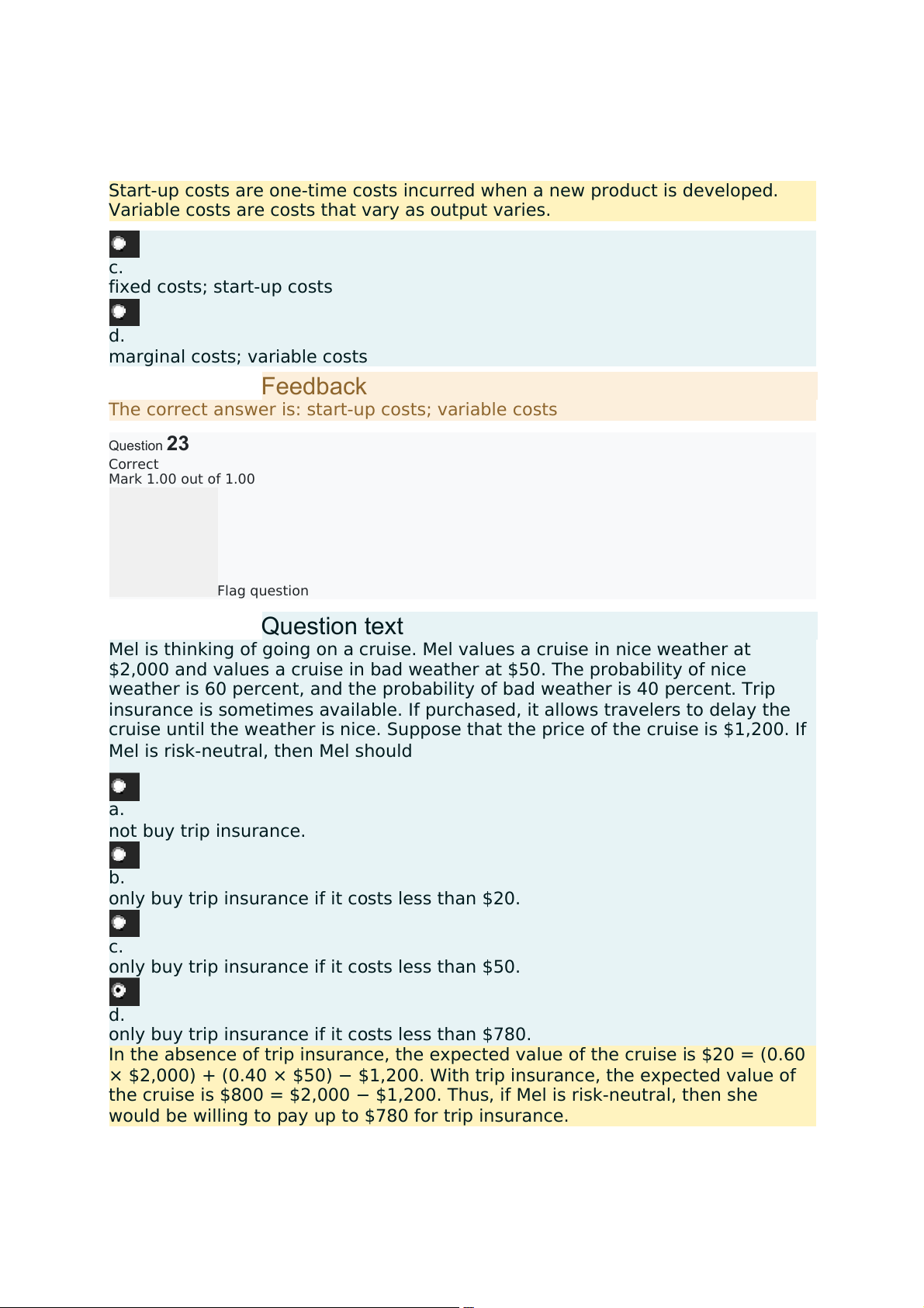 The correct answer is: only buy trip insurance if it costs less than $780. Question 24 Correct Mark 1.00 out of 1.00 Flag question Question text