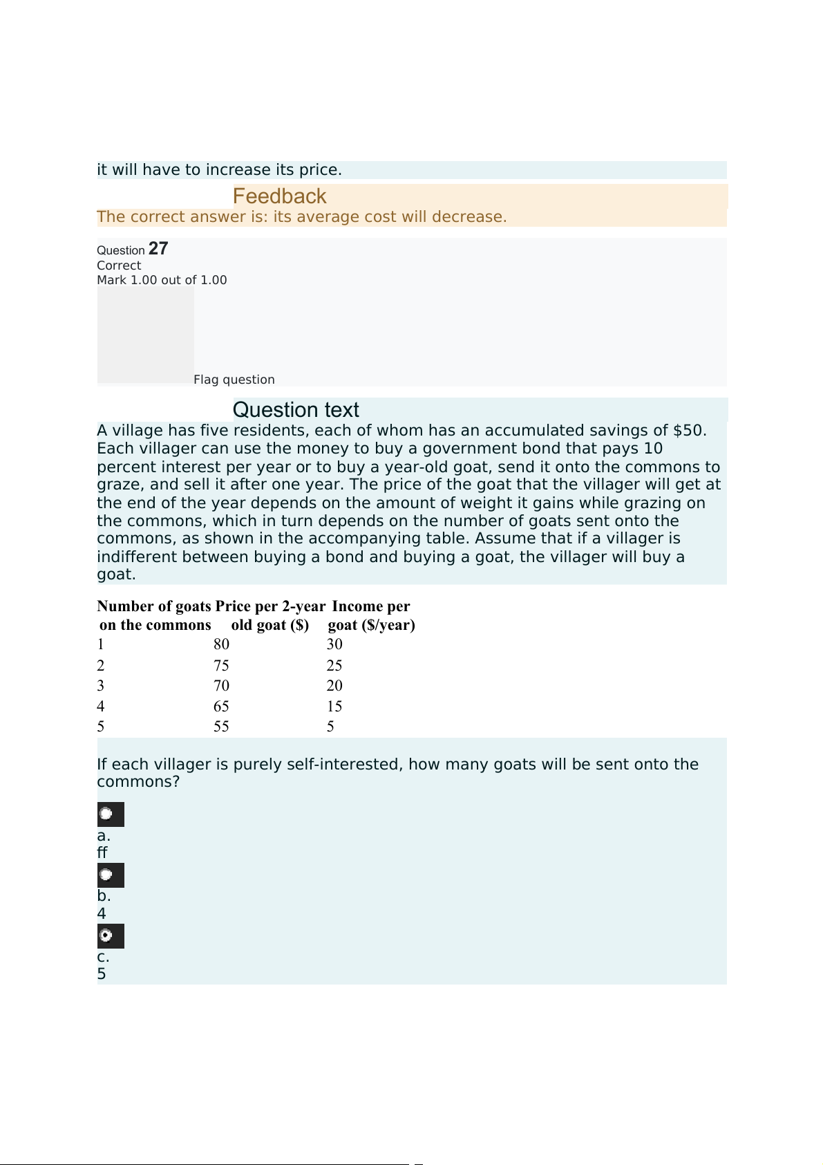 The correct answer is: its average cost will decrease. Question 27 Correct Mark 1.00 out of 1.00 Flag question Question text