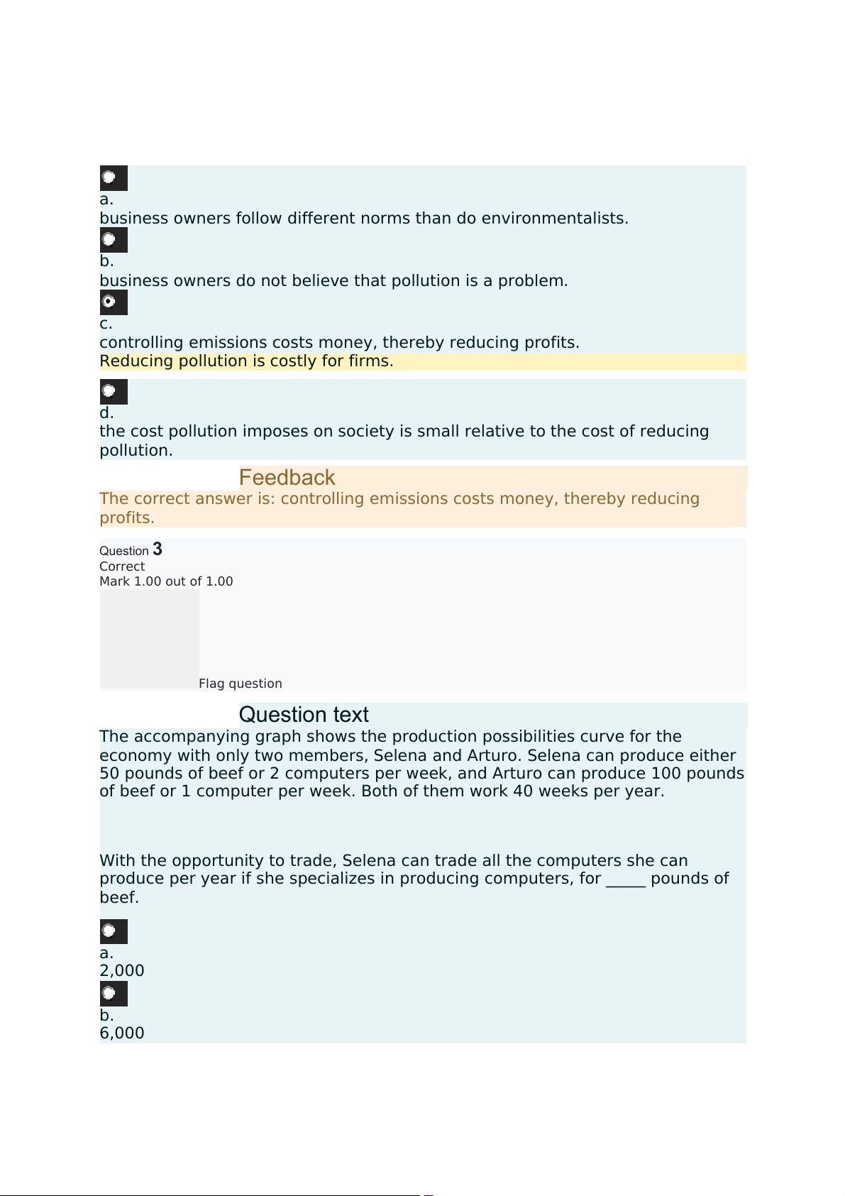 The correct answer is: controlling emissions costs money, thereby reducing profits. Question 3 Correct Mark 1.00 out of 1.00 Flag question Question text