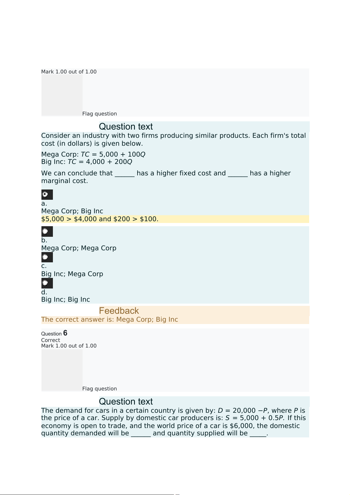 The correct answer is: start-up costs; variable costs Question 23 Correct Mark 1.00 out of 1.00 Flag question Question text