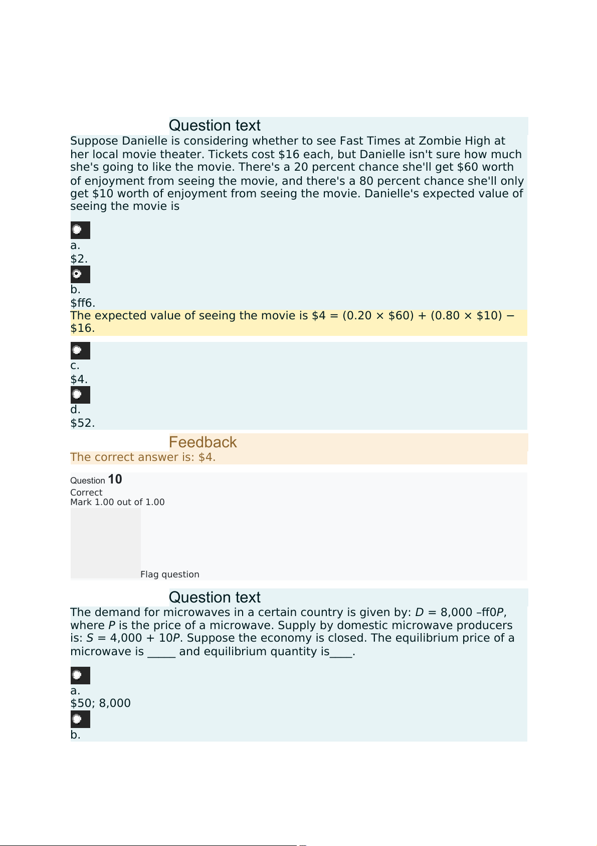 The expected value of seeing the movie is $4 = (0.20 × $60) + (0.80 × $10) − $16. c. $4. d. $52. Feedback The correct answer is: $4. Question 10 Correct Mark 1.00 out of 1.00 Flag question Question text