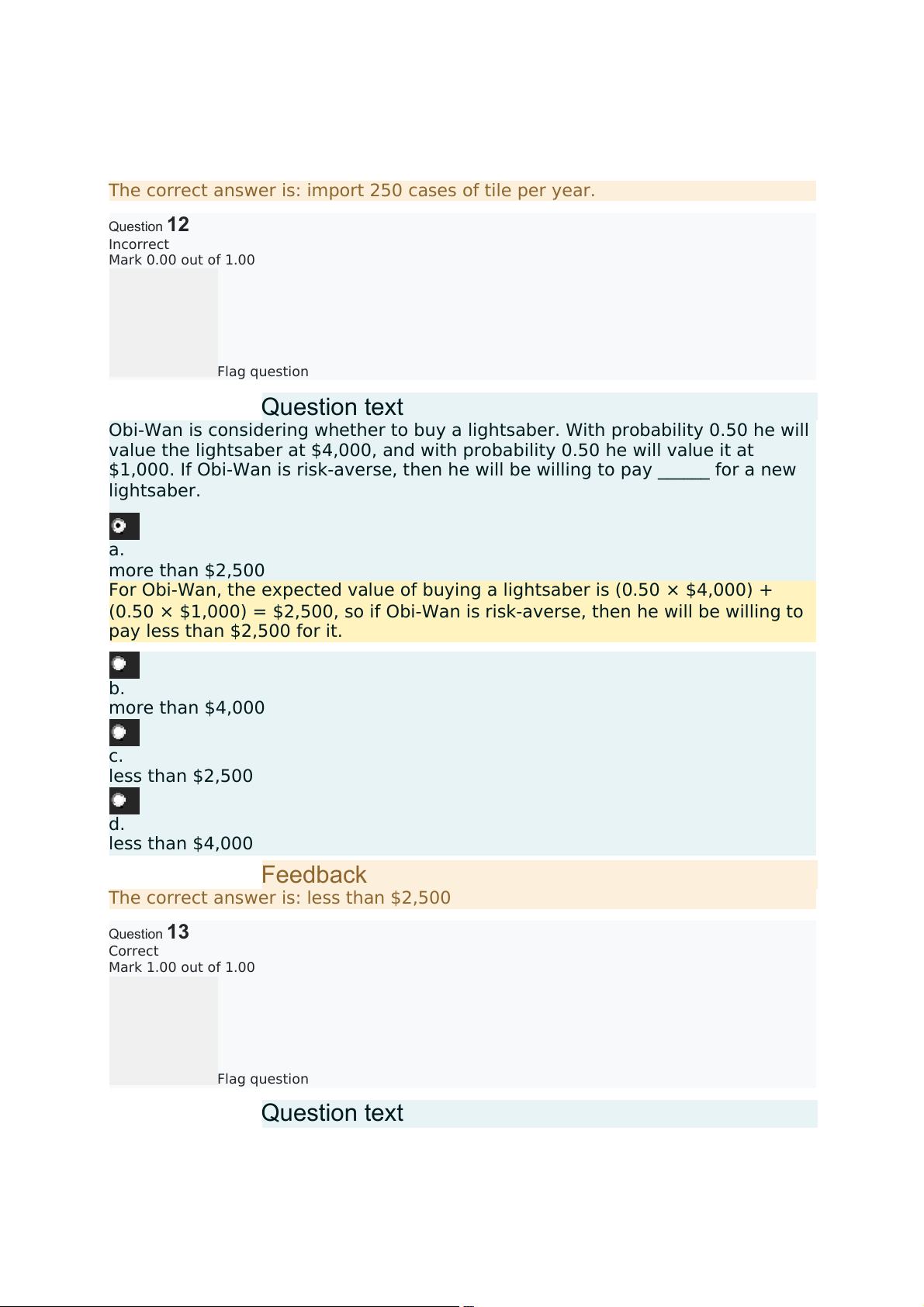 (0.50 × $1,000) = $2,500, so if Obi-Wan is risk-averse, then he will be willing to pay less than $2,500 for it. b. more than $4,000 c. less than $2,500 d. less than $4,000 Feedback