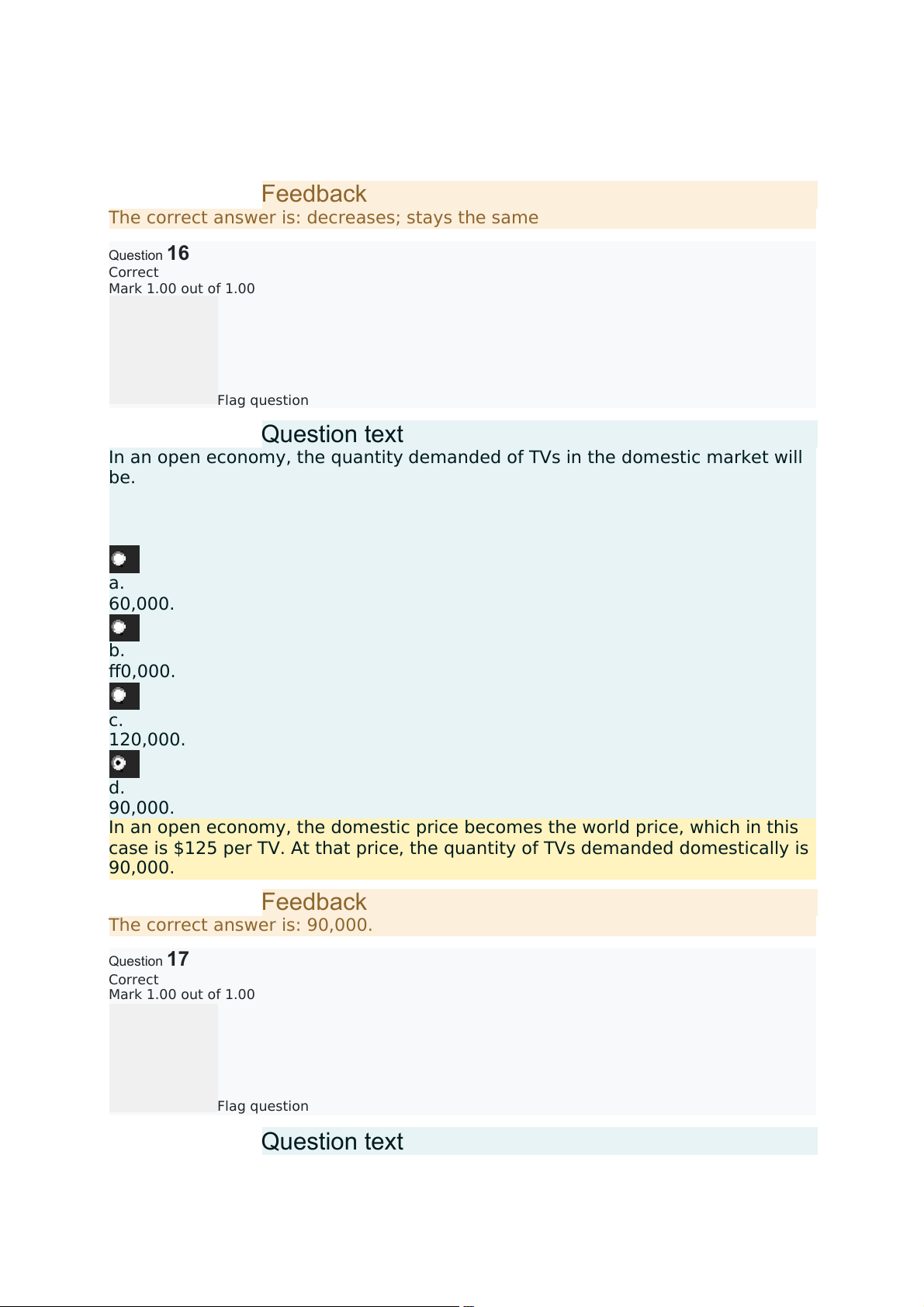 case is $125 per TV. At that price, the quantity of TVs demanded domestically is 90,000. Feedback The correct answer is: 90,000. Question 17 Correct Mark 1.00 out of 1.00 Flag question Question text