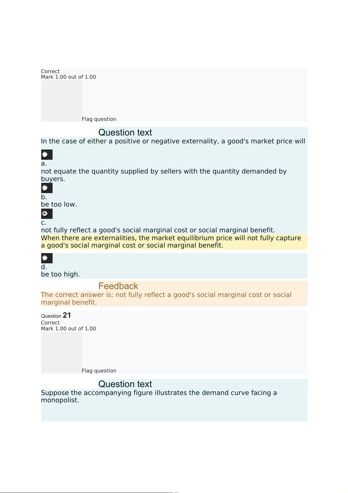 The correct answer is: not fully reflect a good's social marginal cost or social marginal benefit. Question 21 Correct Mark 1.00 out of 1.00 Flag question Question text