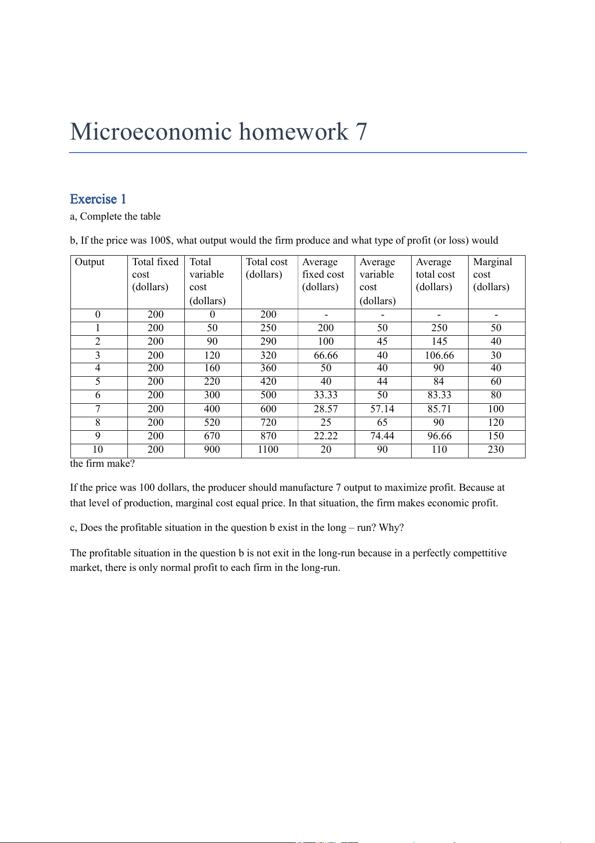 Microeconomic homework 7 Exe Ex r e c r i c s i e s e 1 1 a, Complete the table