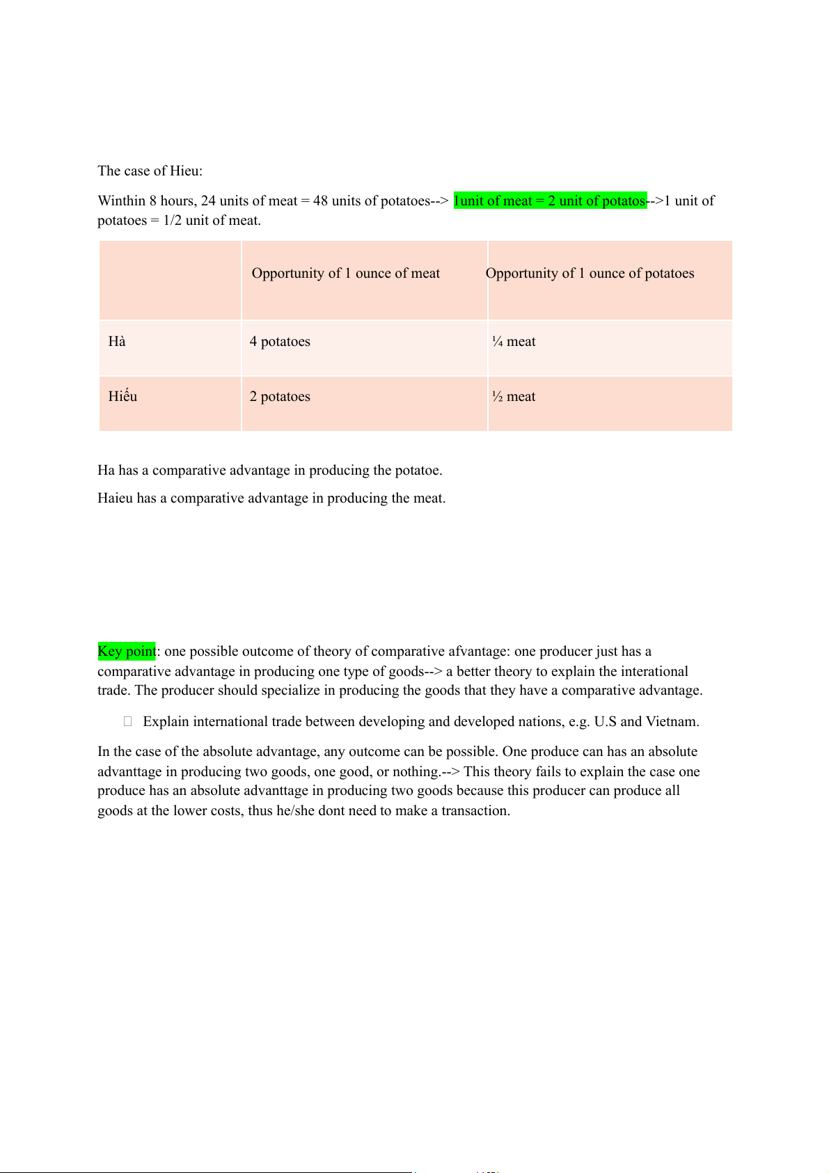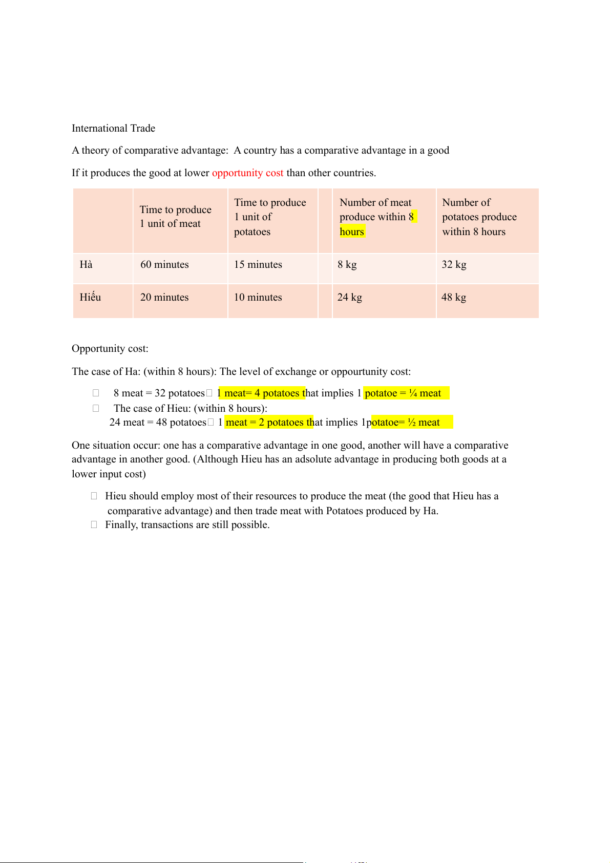 If it produces the good at lower opportunity cost than other countries. Time to produce Number of meat Number of Time to produce 1 unit of produce within 8 potatoes produce 1 unit of meat potatoes hours within 8 hours Hà 60 minutes 15 minutes 8 kg 32 kg Hiếu 20 minutes 10 minutes 24 kg 48 kg Opportunity cost: