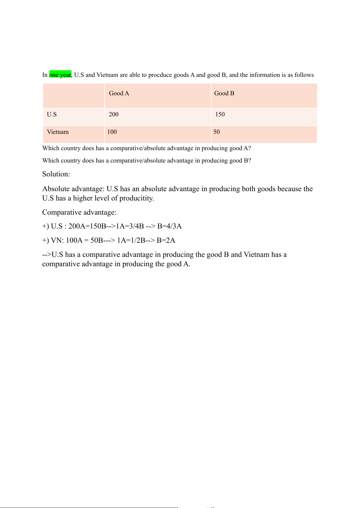 In one year, U.S and Vietnam are able to procduce goods A and good B, and the information is as follows Good A Good B U.S 200 150 Vietnam 100 50