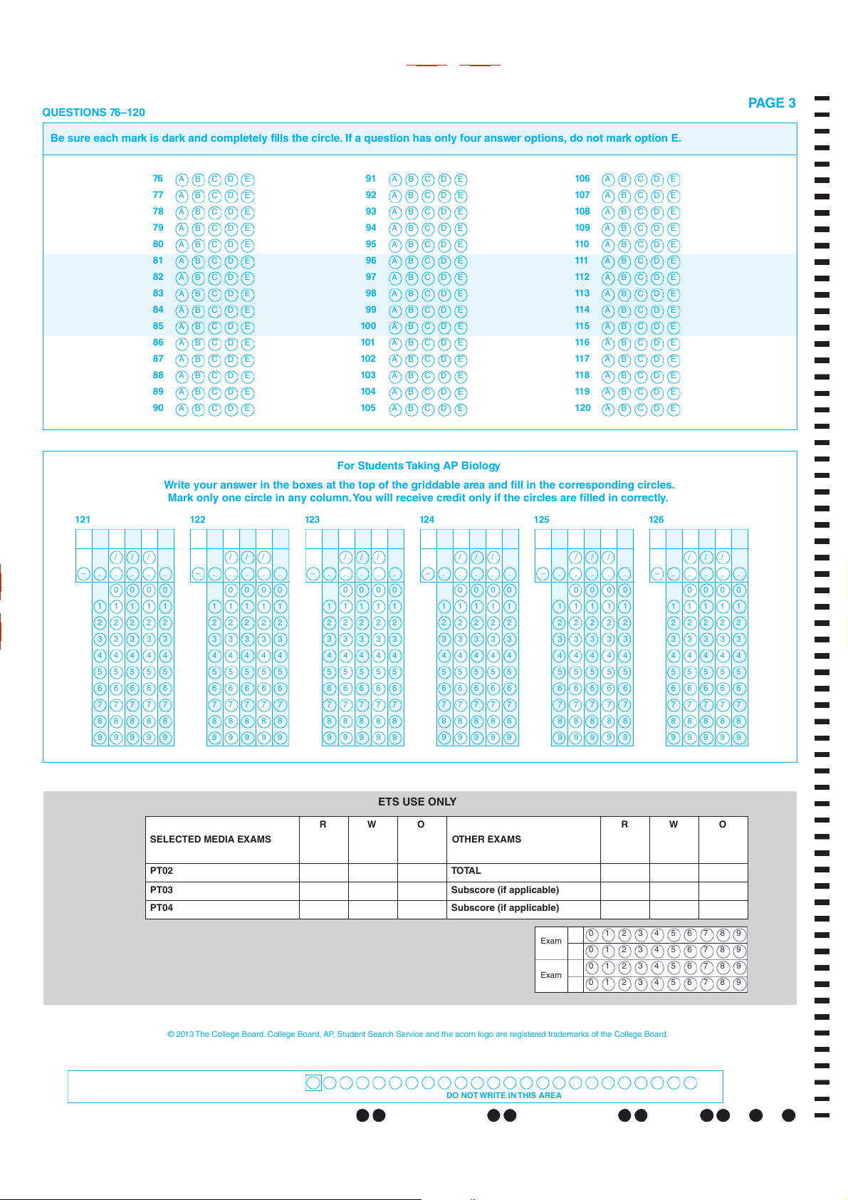 Be sure each mark is dark and completely fills the circle. If a question has only four answer options, do not mark option E. 76 A B C D E 91 A B C D E 106 A B C D E 77 A B C D E 92 A B C D E 107 A B C D E 78 A B C D E 93 A B C D E 108 A B C D E 79 A B C D E 94 A B C D E 109 A B C D E 80 A B C D E 95 A B C D E 110 A B C D E 81 A B C D E 96 A B C D E 111 A B C D E 82 A B C D E 97 A B C D E 112 A B C D E 83 A B C D E 98 A B C D E 113 A B C D E 84 A B C D E 99 A B C D E 114 A B C D E 85 A B C D E 100 A B C D E 115 A B C D E 86 A B C D E 101 A B C D E 116 A B C D E 87 A B C D E 102 A B C D E 117 A B C D E 88 A B C D E 103 A B C D E 118 A B C D E 89 A B C D E 104 A B C D E 119 A B C D E 90 A B C D E 105 A B C D E 120 A B C D E