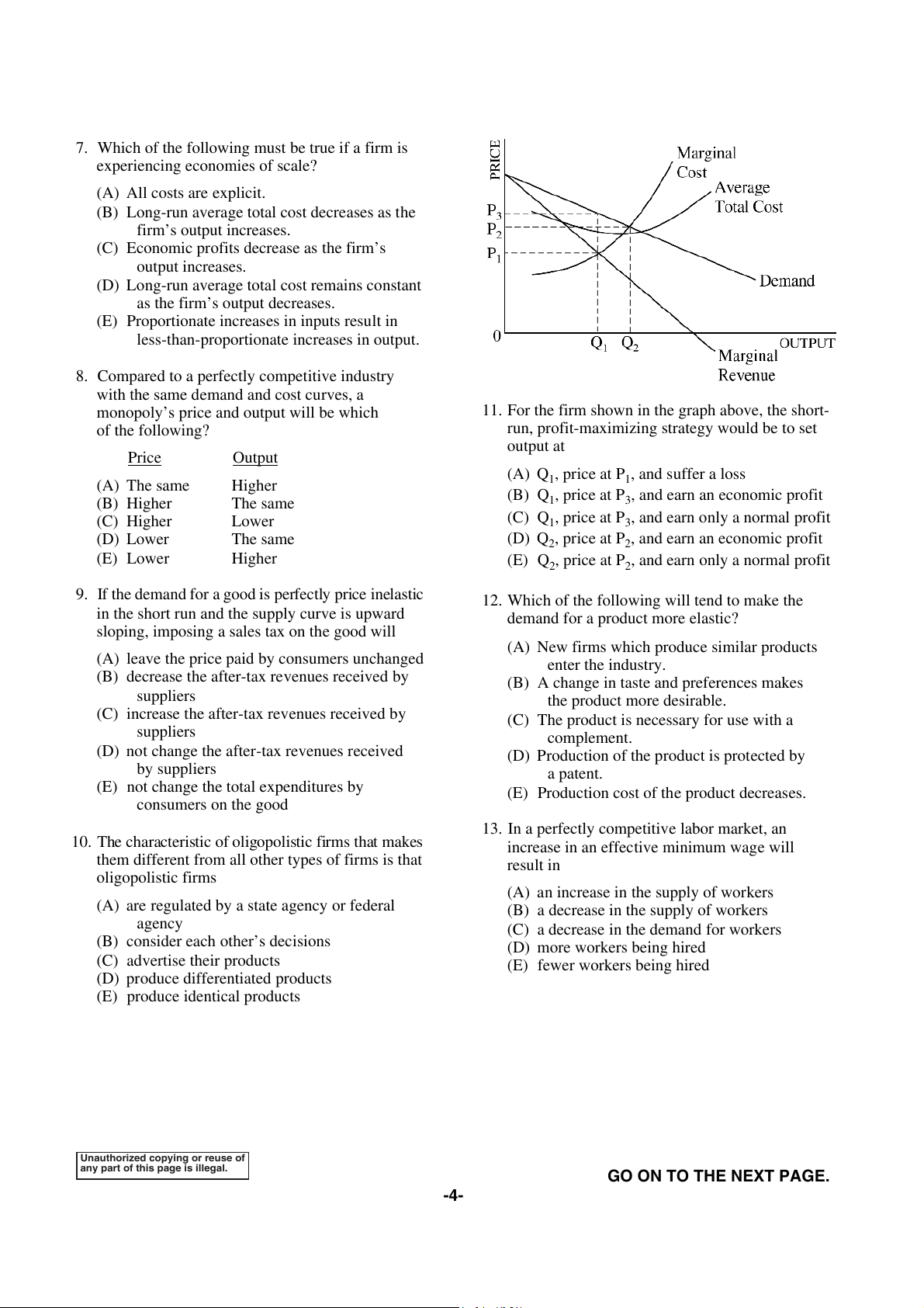 (B) diminishing marginal product (B) inelastic (C) diseconomies of scale (D) economies of scale (C) unit elastic (D) perfectly elastic (E) increasing fixed costs (E) perfectly inelastic