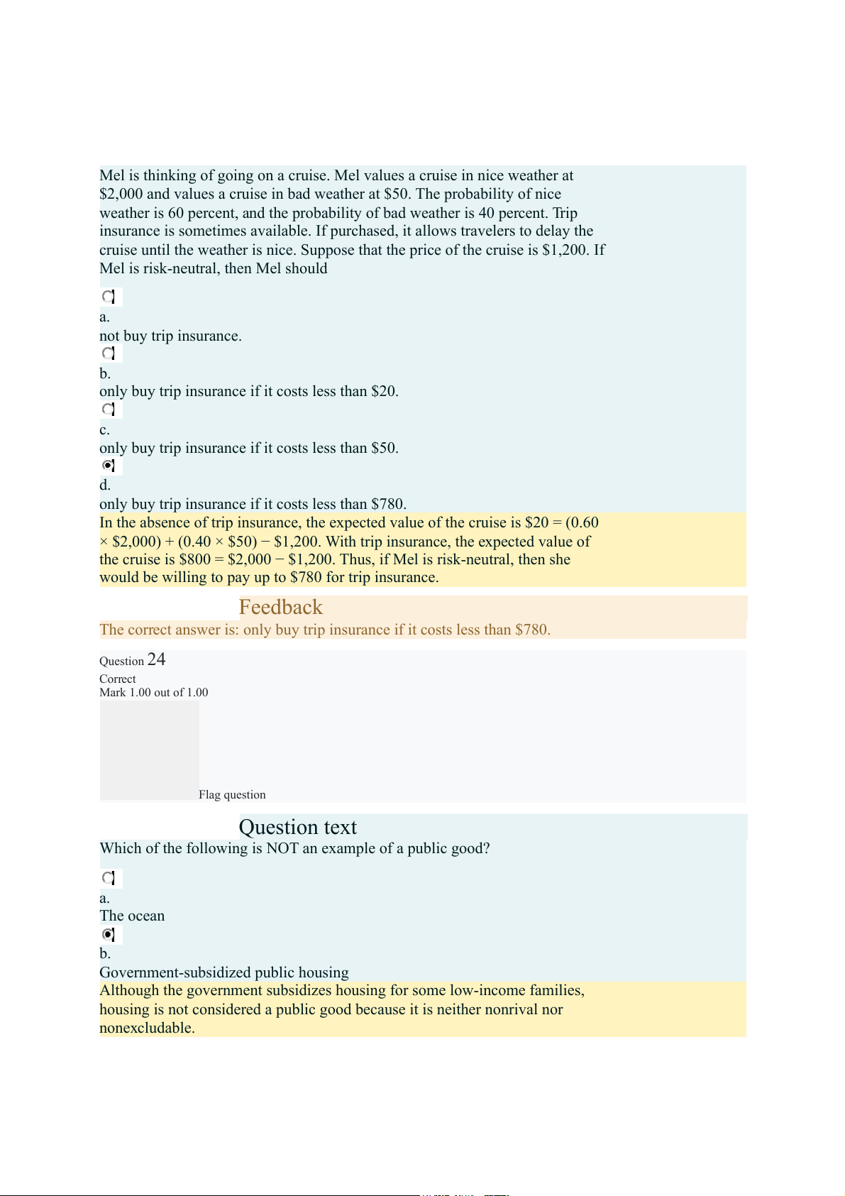 The correct answer is: only buy trip insurance if it costs less than $780. Question 24 Correct Mark 1.00 out of 1.00 Flag question Question text