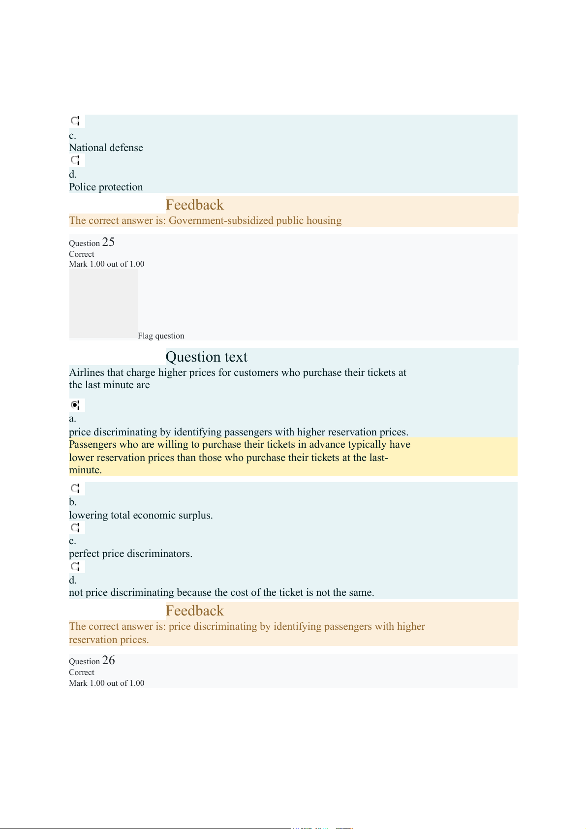 The correct answer is: price discriminating by identifying passengers with higher reservation prices. Question 26 Correct Mark 1.00 out of 1.00 Flag question Question text